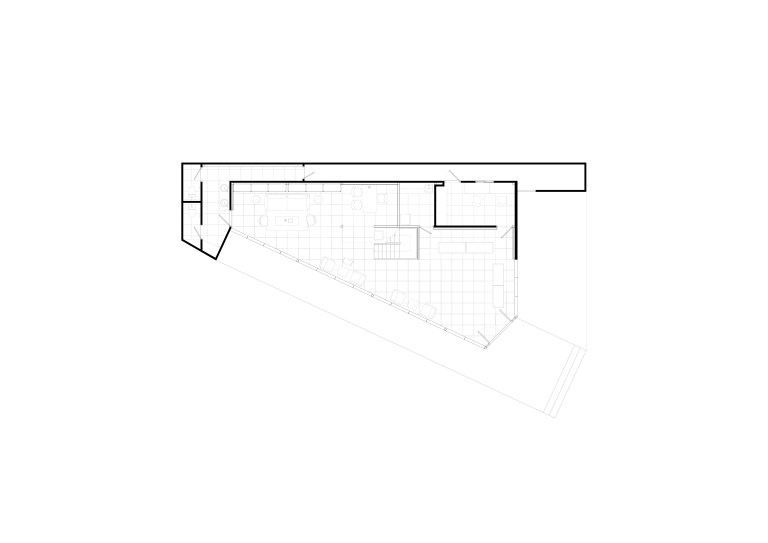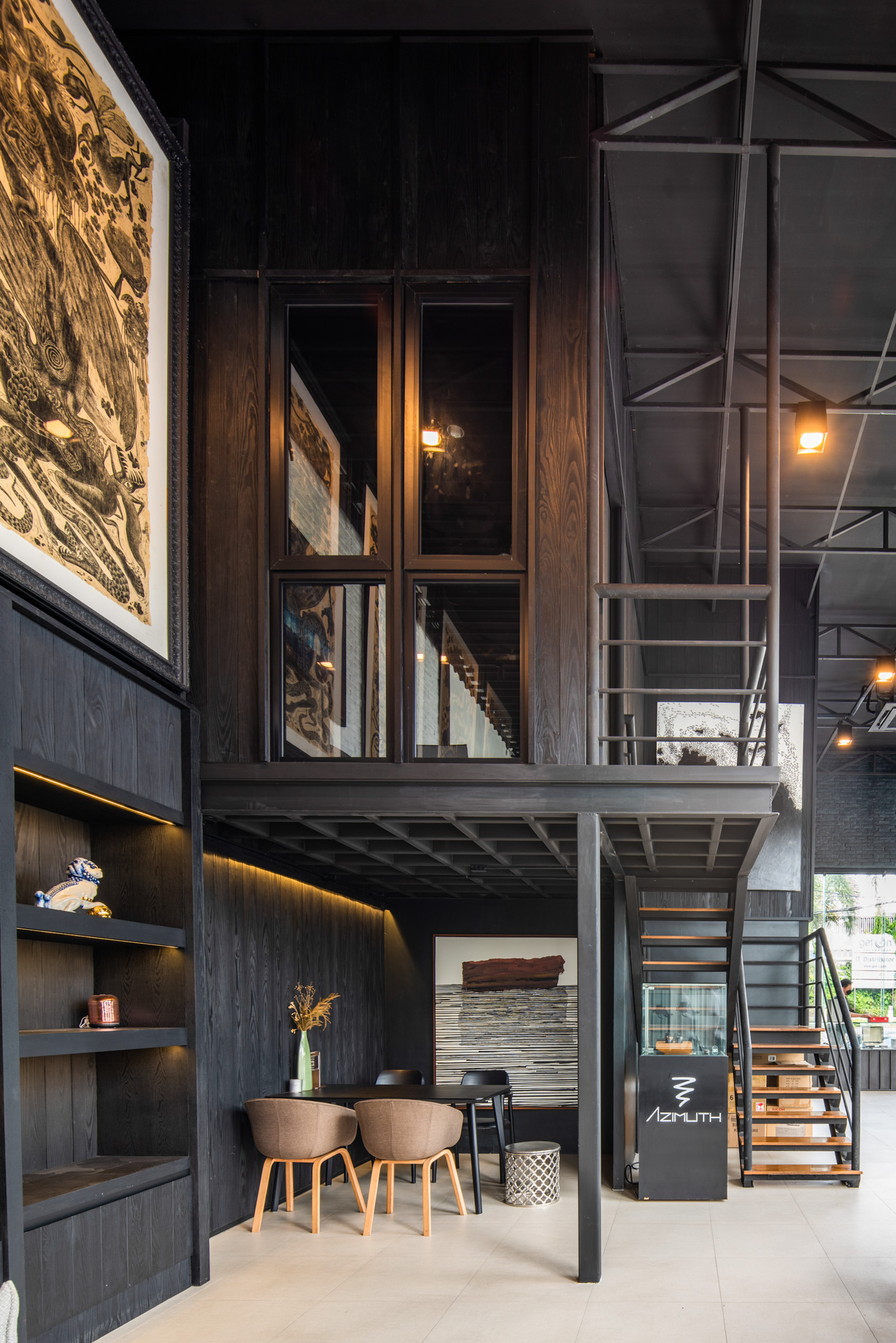 To save space in other portions of the shop, the designers planned to put a restroom at the end of the triangle. The designers increased the size of the mezzanine on the upper floor to facilitate more personal discussions or 5-6 person negotiations, or to serve as the owner and partner’s office.