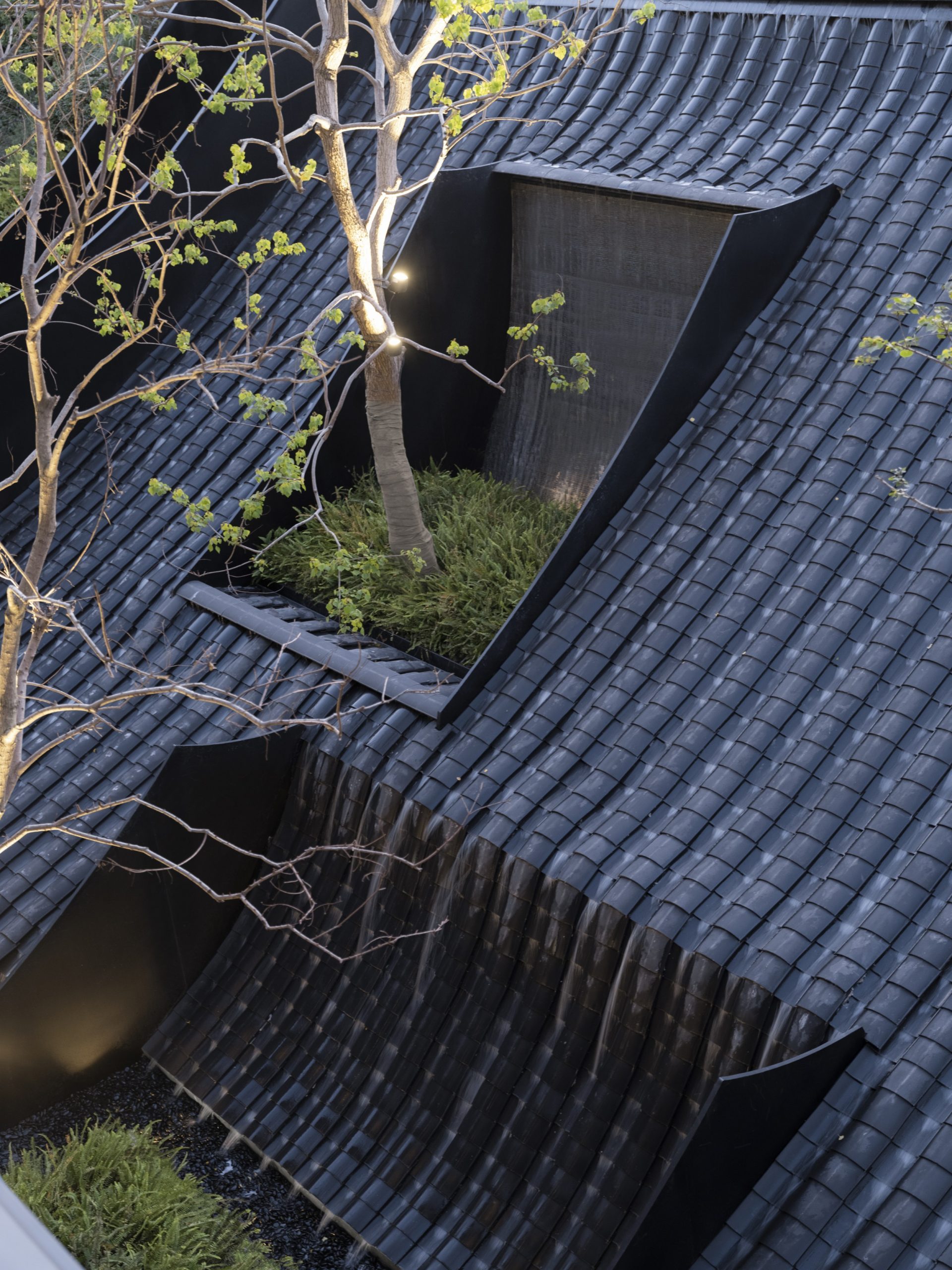 ทีมออกแบบได้รับแรงบันดาลใจในหลายๆ ด้านจากการค้นคว้าเกี่ยวกับเมืองริมน้ำ Shaoxing ตัวอย่างที่สังเกตได้ชัดเจนคือ โครงสร้างหลังคาโบราณเป็นกระเบื้องที่ทับซ้อนกันอย่างละเอียดอ่อน ช่วยกันฝนระบายน้ำได้อย่างมีประสิทธิภาพ ซึ่งสอดคล้องกับสภาพแวดล้อมของ Shaoxing เมืองเก่าที่มีฝนตกชุกทุกปี จนบางคราอาจเกิดน้ำท่วมในบางพื้นที่ เมื่อทีมออกแบบเริ่มให้ความใส่ใจกับความสัมพันธ์ระหว่างหลังคาที่ปกป้องผู้คนจากน้ำฝนที่ไหลลงมาไม่ขาดสาย สังเกตรูปแบบรางน้ำและวิธีที่ชาวเมืองจัดการกับน้ำฝนแล้ว ก็อดไม่ได้ที่จะเก็บเอาคอนเซ็ปต์นี้มาสื่อสารใหม่