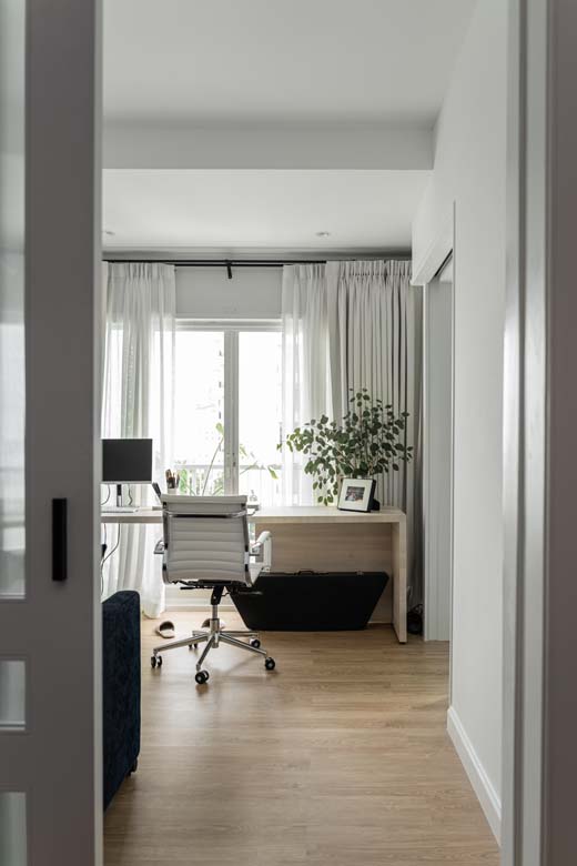ใกล้กันเป็นห้องทำงานซึ่งเป็นการออกแบบห้องที่อยู่ตรงกลางของบ้านให้รู้สึกว่าไม่เป็นห้อง แต่เป็นสเปซที่เชื่อมต่อถึงกัน เป็นความตั้งใจของคุณโอ๋เอง “โอ๋ปรับพื้นที่ส่วนนี้ที่จากเดิมเป็นห้องนอนห้องที่ 2 ลดขนาดลงรวมถึงรื้อห้องอาบน้ำในห้องนอนนี้ออกไปด้วย แต่ยังคงเก็บส่วนอ่างล้างมือและชักโครกไว้ โดยสลับประตูเข้าห้องน้ำนี้ให้เข้าจากด้านนอกของส่วนห้องทำงานแทน และใช้งานเป็นห้องน้ำรับแขก