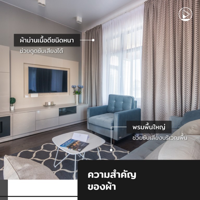 สำหรับใครที่ไม่สะดวกจะรื้อบ้านใหม่ เพื่อซ่อมแซมแก้ไขปัญหาเรื่องเสียง เราแนะนำวัสดุสามัญประจำบ้านอย่าง ผ้า ไม่ว่าจะเป็นผ้าม่านเนื้อดีชนิดหนา ที่ช่วยดูดซับเสียงได้ ซึ่งในปัจจุบันยังมีการพัฒนาเทคโนโลยีที่ช่วยให้ผ้ามีน้ำหนักเบาและดูดซับเสียงได้มากขึ้นอีกด้วย รวมไปถึงการเลือกใช้พรมพื้นใหญ่มาช่วยซับเสียงบริเวณพื้น เป็นเทคนิคเล็ก ๆ ที่รับรองว่ามีส่วนช่วยแน่นอน