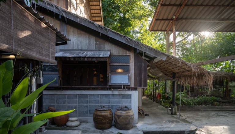 โซนครัวที่นอกจากใช้ทำอาหาร รับประทานข้าว ก็ยังใช้เป็นที่รับแขกด้วย รีโนเวทปรับเปลี่ยนโต๊ะครัวกลางแบบไอส์แลนด์ ดัดแปลงจากโต๊ะจัดเลี้ยงของคุณตา เปลี่ยนท็อปเป็นกระเบื้อง เพิ่มรัดขาโต๊ะด้านล่างเป็นที่วางของ ออกแบบช่องแสงเป็นฝาไหล มีมุกที่ยื่นออกไปสำหรับคว่ำจาน กันสาดบริเวณแท่นปูนเปลือยตั้งเตาไฟอั้งโล่ ทุกอย่างสอดคล้องกับการใช้งานของครัวภายใน
