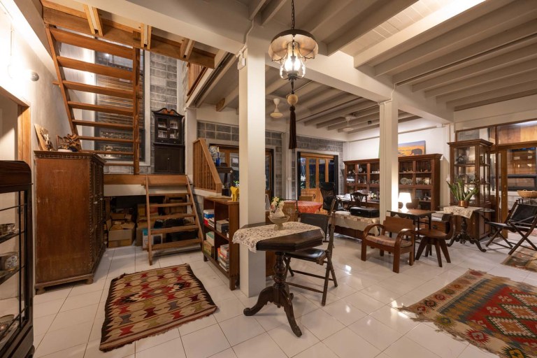 โถงทางเข้าบ้านที่เปิดหลังคาในส่วนที่ต่อเติมจากบ้านหลักให้ทะลุถึงชั้น 2 รื้อผนังชั้น 2 แล้วใส่ราวกันตก ตั้งเสาใหม่ก่อผนังอิฐบล็อคเป็นฐาน ส่วนสลักและเดือยก็ไม่ได้ถูกซ่อนกลืนไปกับโครงสร้างไม้ ได้ถูกโชว์ทักษะการออกแบบรายละเอียดออกมาเต็มที่ ยึดโครงสร้างขนาดใหญ่เอาไว้อย่างมั่นคง และมีเสน่ห์แตกต่างที่เป็นเอกลักษณ์