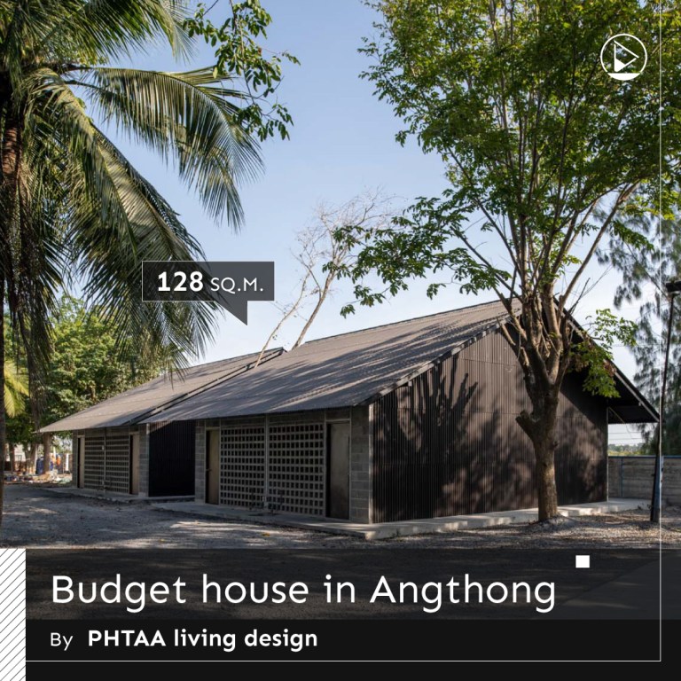 Budget house in Angthong สร้างขึ้นในพื้นที่โรงงานแปรรูปน้ำมันรำข้าว จังหวัดอ่างทอง โดยเจ้าของบ้านต้องการสร้างที่พักตากอากาศภายในพื้นที่ทำงานของตัวเองเพื่อลดเวลาเดินทางไปกลับบ้านและโรงงานที่อยู่กันคนละจังหวัด โจทย์จึงต้องเป็นบ้านที่เหมาะกับการเข้าพัก 3-4 วันต่อสัปดาห์ ดูแลรักษาง่าย ผ่อนคลายได้อย่างเป็นส่วนตัว ราคาก่อสร้างตามงบจำกัด และสามารถทำเสร็จได้ไว โดยโจทย์ทั้งหมดถูกส่งไปถึงมือของ PHTAA living design ทีมออกแบบที่ตั้งใจจะใช้ความคิดสร้างสรรค์เอาชนะความท้าทายในครั้งนี้