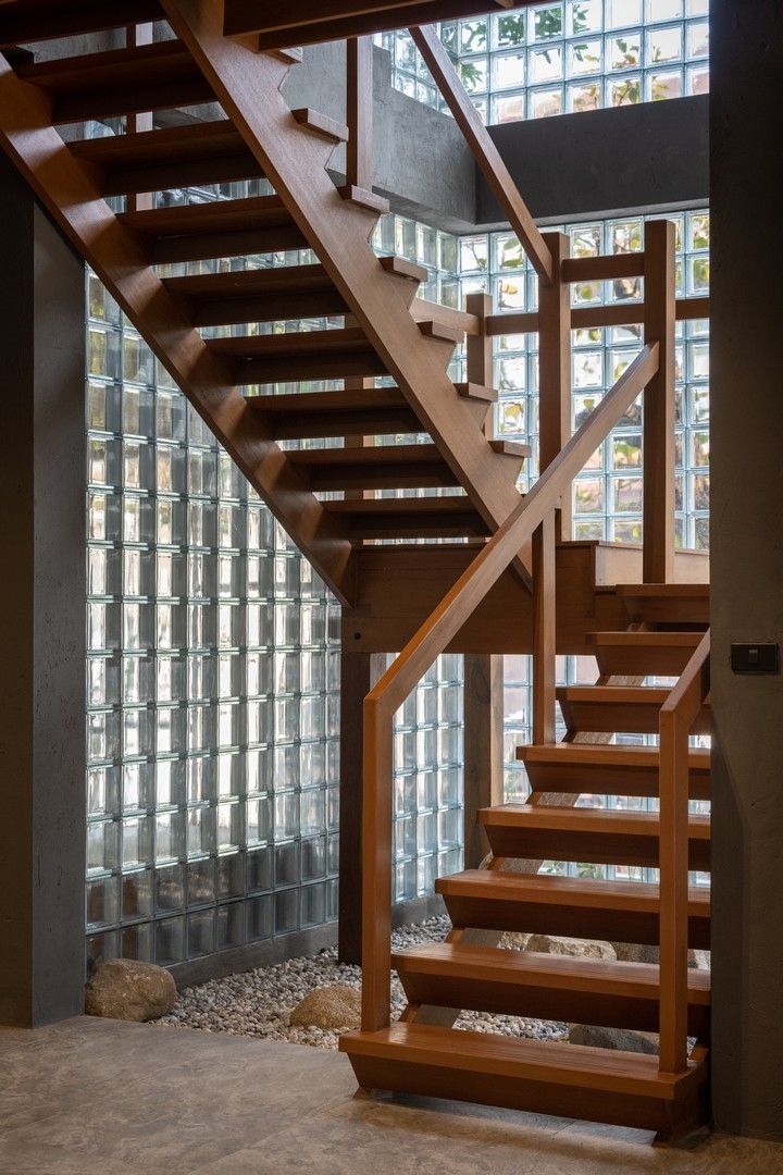 ในส่วนของบล็อกแก้วสถาปนิกเลือกใช้เหล็กฉากประกบกับไม้สักทอง ทำหน้าที่เป็นเสารับน้ำหนักตัวบล๊อคแก้ว แล้วใช้น็อตสกรูยึดเข้ากับตัวบล๊อคแก้วในด้านข้าง ในรายละเอียดนี้เป็นการทดลองของสถาปนิก ซึ่งจะทำให้เห็นแค่สันเหล็กที่โผล่ออกมา