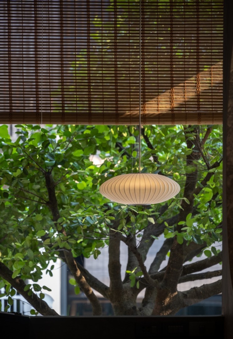 บริเวณโต๊ะด้านหน้าริมกระจก TEMPERATE 10 mm. ที่ติดอลูมิเนียมลายไม้ AT ให้แสงสว่างด้วยโคมไฟสีขาวของ chanintr รุ่น Nelson Saucer Bubble Pendant เพื่อให้บรรยากาศหน้าร้านดูหรูหรา เพราะดีไซน์ของดวงไฟมีความคลาสสิค แต่ก็ดูมีความทันสมัย ช่วยเป็นภาพจำให้กับลูกค้าได้เป็นอย่างดี ในช่วงเวลากลางวันเมื่อไม่ได้เปิดไฟ แสงจากภายนอกจะทำหน้าที่ลอดเข้ามาผ่านกระจกให้ความสว่างกับภายใน แต่ถ้าหากลูกค้าต้องการลดแสงจ้า หรืออยากเพิ่มความเป็นส่วนตัวมากยิ่งขึ้น สถาปนิกได้ติดตั้งมูลี่ไม้ไผ่ไว้สำหรับกรองแสง ซึ่งเมื่อมูลี่ถูกปิดลง คนภายนอกจะไม่สามารถมองเห็นคนภายในได้แบบชัดเจน แต่ภายในยังเกิดแสงแดดที่กระทบพื้นที่สีเขียวเข้ามายังภายในแบบสลัวๆ นอกจากนี้ตัวมูลี่ยังช่วยเพิ่มความรู้สึกอบอุ่นให้กับรูปด้านอาคารในแนวทางตั้งได้อย่างน่าสนใจ