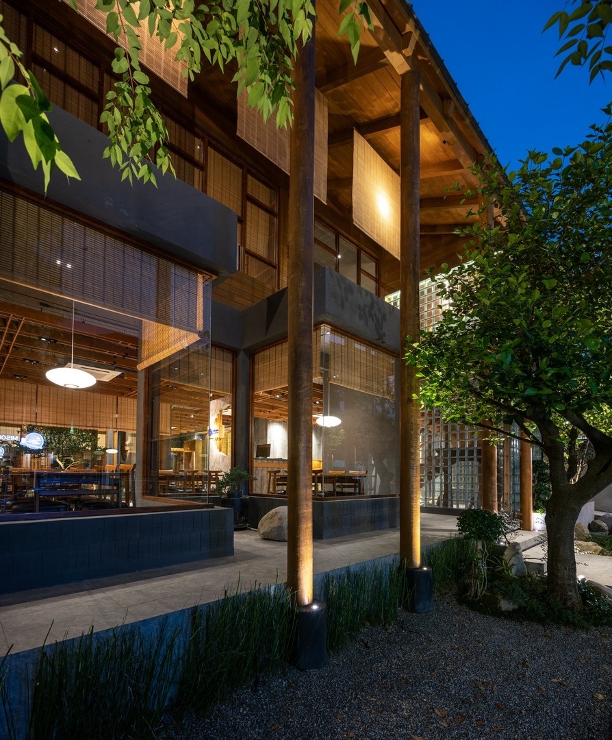 สถาปนิกวางผังให้ลูกค้าที่กำลังนั่งรับประทานอาหาร สามารถมองเห็นพื้นที่สีเขียวได้ทั้งหมด โดยในเบื้องต้นเลือกล้อมรั้วด้วยไทรเกาหลี และใช้ไม้ประธานอย่างเสม็ดแดงที่มีสีเขียวสลับแดง และมีรูปฟอร์มที่สวยงามทำให้นึกถึงความเป็นญี่ปุ่น ในส่วนความหนาของพื้นอาคารด้วยทุ่งหญ้าถอดปล้อง เพราะมีฟอร์มตั้งตรงและดูแลรักษาง่าย ในบางจุดด้านหน้าจะมีก้อนหินวางไว้ให้รู้สึกเป็นธรรมชาติมากยิ่งขึ้น