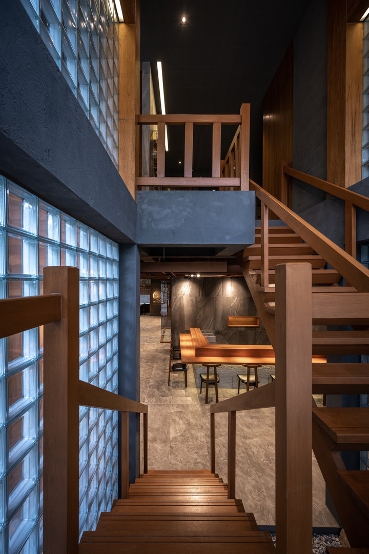 จากแพทเทิร์นรูปด้านอาคารที่เป็นประจกกับมูลี่ สถาปนิกได้เพิ่มเติมความโดดเด่นของหน้าตาอาคารด้วยบล็อกแก้ว จากแบรนด์ช้างแก้ว ติดตั้งไว้ในบริเวณโถงบันไดไม้สำหรับขึ้นไปบริเวณชั้นสอง เมื่อถึงช่วงกลางคืนไฟที่ส่องสว่างจะช่วยขับเน้นให้ตัวบันไดไม้สักให้มีลักษณะที่โดดเด่น และช่วยกระจายไฟไปยังภายนอกให้เกิดเป็นภาพจำของลูกค้าเป็นสัญลักษณ์ว่าร้านแห่งนี้ได้เปิดทำการขึ้นในช่วงเวลาเย็นแล้ว