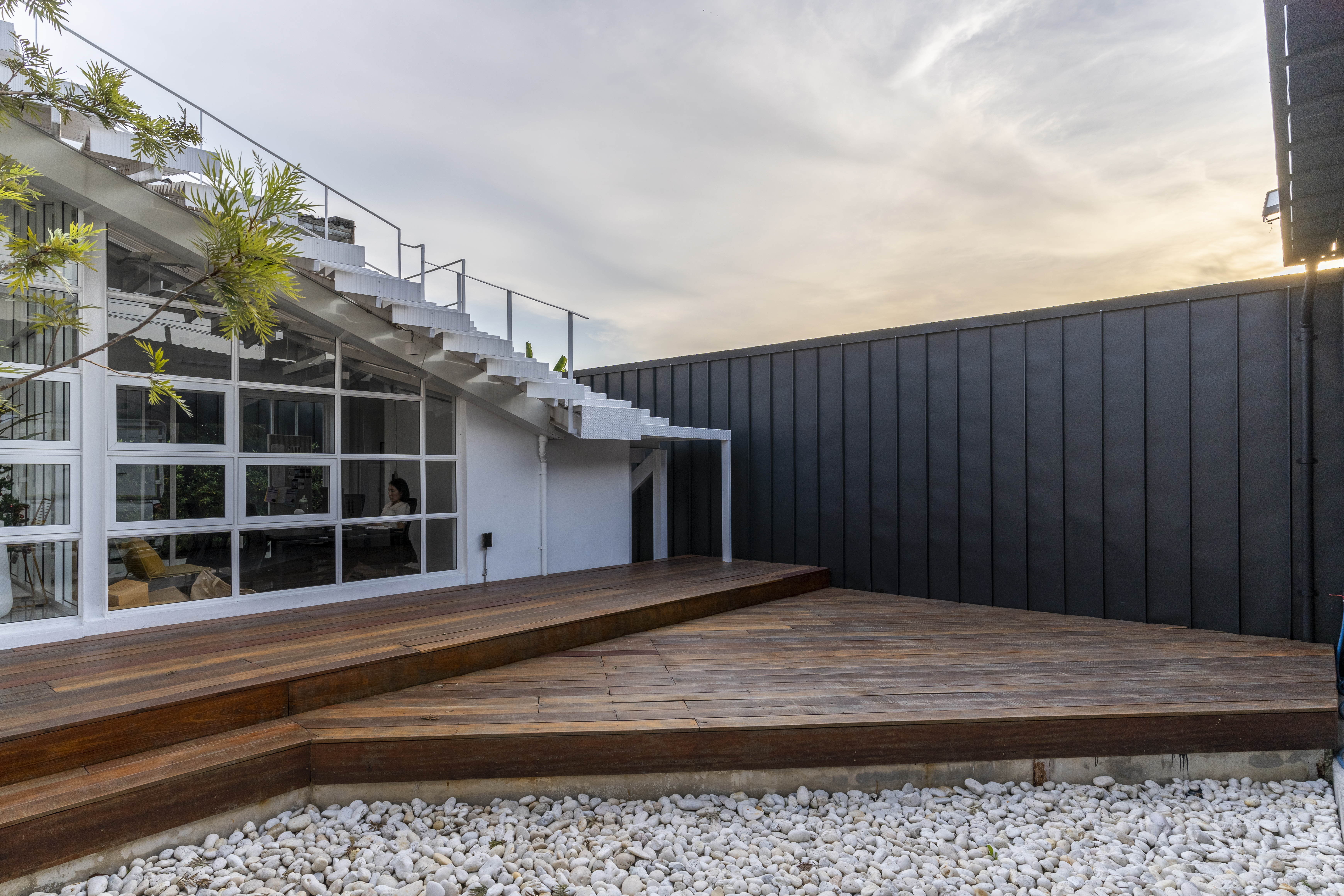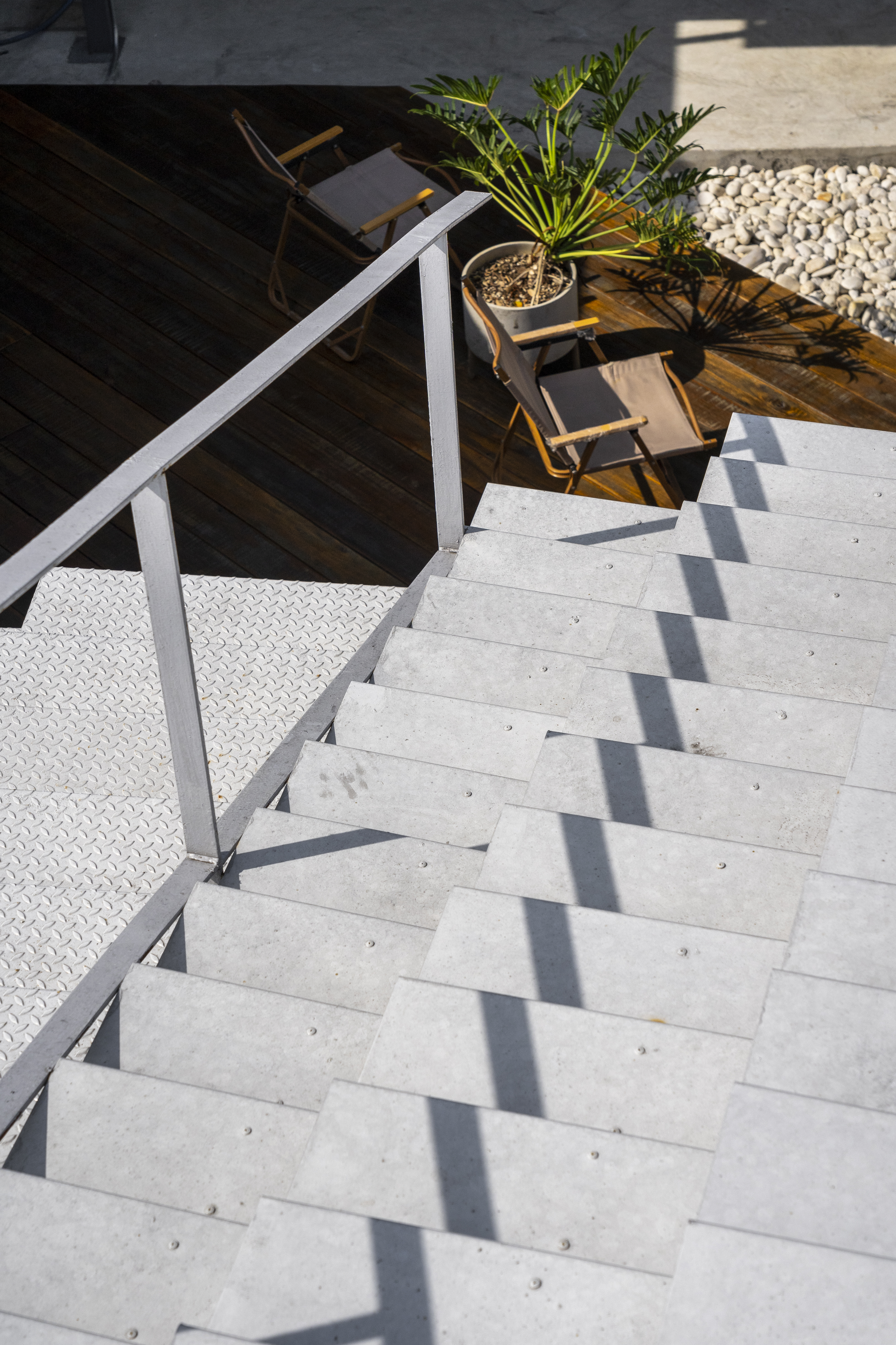 ปกติแล้วบันไดมักเป็นสัญลักษณ์ของการก้าวขึ้นไปสู่จุดหมายปลายทาง แต่สำหรับการออกแบบครั้งนี้ สถาปนิกไม่ได้ต้องการให้บันไดเป็นเพียงแค่ทางผ่านนำพาไปสู่พื้นที่ดาดฟ้าเท่านั้น แต่ต้องการให้สามารถรองรับการใช้งานได้หลากหลาย ไม่ว่าจะเป็นพื้นที่ถ่ายแบบเพื่อโปรโมทสินค้า หรือจะนั่งเล่นชมจันทร์ก็ได้