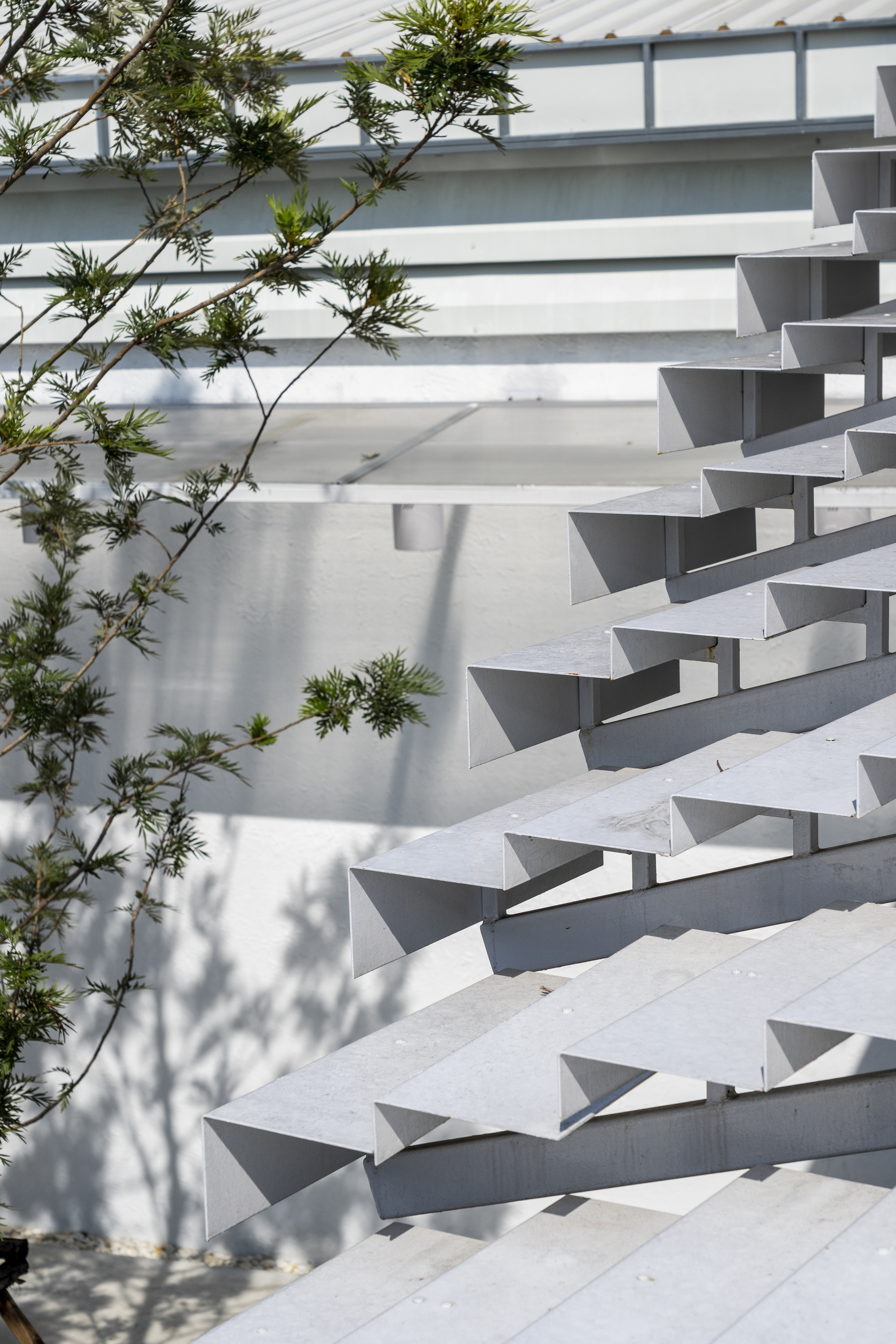 ด้วยข้อจำกัดของขนาดพื้นที่โครงการ ทำให้มีความยากในการก่อสร้างและขนย้ายวัสดุ สถาปนิกจึงเลือก ‘เหล็ก’ เป็นวัสดุหลักที่ใช้สำหรับฟาซาด เนื่องจากมีน้ำหนักเบา ช่วยลดความยุ่งยากหน้างาน รวมทั้งตอบโจทย์กับดีเทลของบันไดที่มีความต่อเนื่องกัน ซึ่งการใช้เหล็กก็ช่วยให้สามารถเชื่อมต่อแต่ละจุดเข้าหากันง่ายมากขึ้น