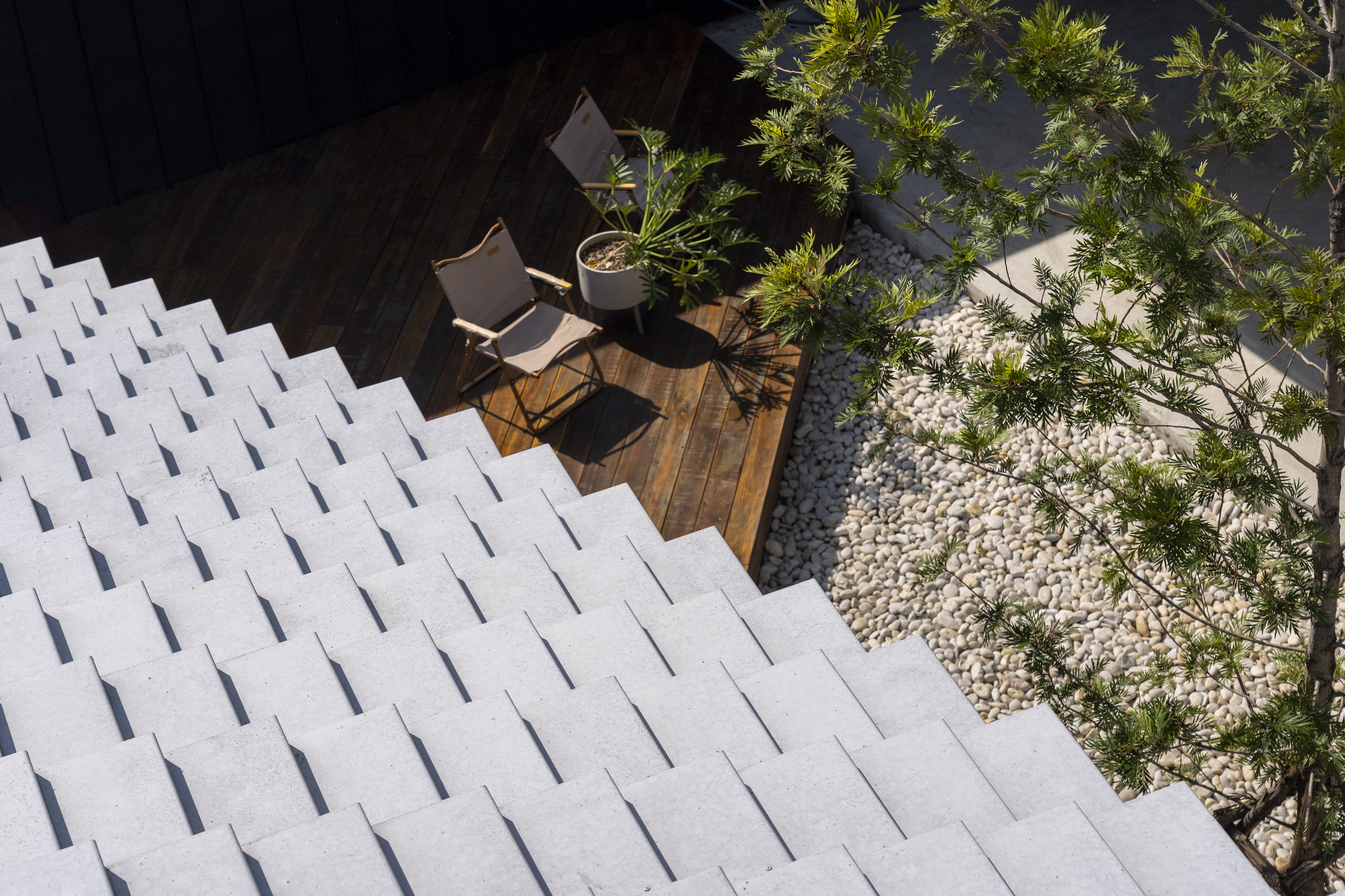 “เราเริ่มจากการตั้งคำถามว่า นอกจากทำหน้าที่กันแดดกันฝนแล้ว หลังคาจะเป็นอย่างอื่นได้ไหม? เราสามารถขึ้นไปใช้งานบนหลังคาได้หรือเปล่า?” สถาปนิกเล่าถึงที่มาของการออกแบบ