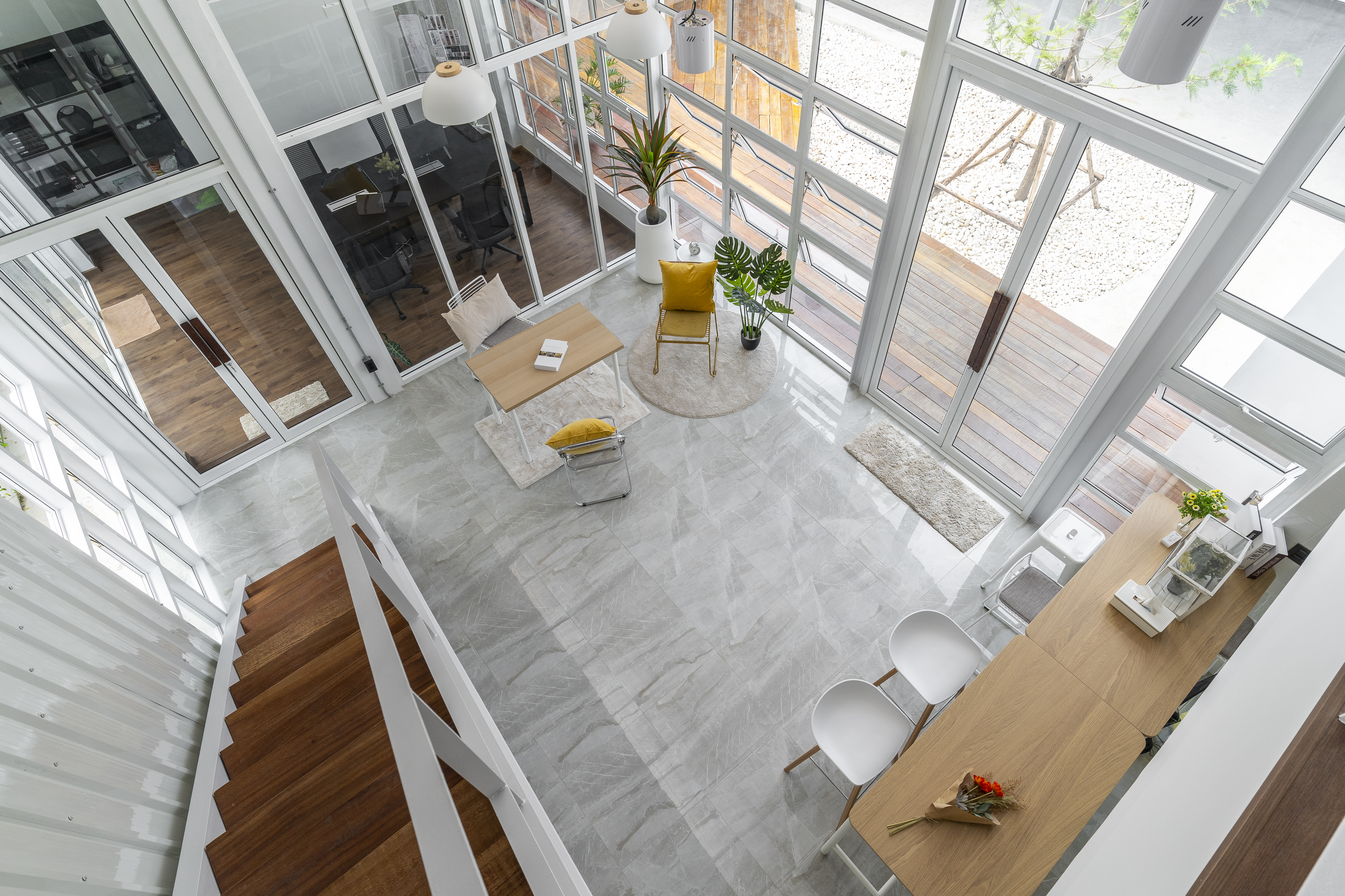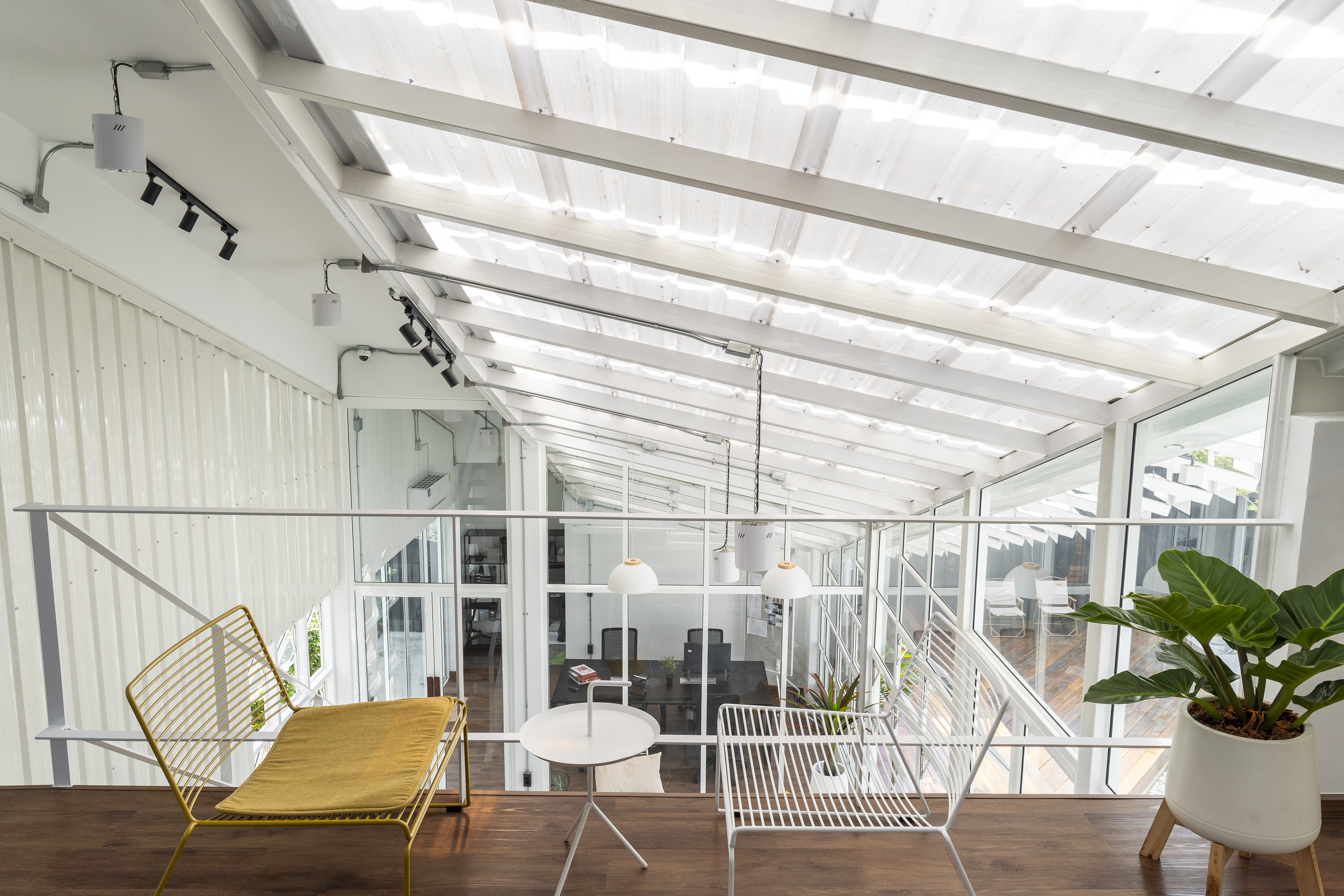 โดยทั่วไปแล้ว เรามักจะได้ยินคำว่า Form follows Function ซะมากกว่า แต่สำหรับโครงการนี้ สถาปนิกตั้งใจให้ Form เป็นตัวกำหนดการวาง Function ภายในอาคารออฟฟิศ โดยออกแบบให้สเปซโถงกลางเป็น Living Area สำหรับใช้งานอเนกประสงค์ ที่มี Double volume space พร้อมช่องเปิดทั้งแนว เพื่อให้ลมสามารถพัดผ่านเข้าสู่ภายในตัวอาคารได้อย่างสะดวก ในส่วนของสเปซที่ถูกกดต่ำกว่าบริเวณอื่น สถาปนิกออกแบบให้เป็นห้องทำงานที่มีขนาดพอดีและค่อนข้างเป็นส่วนตัว นอกจากนี้สถาปนิกยังได้เลือกใช้เฟอร์นิเจอร์ลอยตัว ที่สามารถปรับเปลี่ยน ยกย้ายได้สะดวก เพื่อให้ตอบโจทย์กับความต้องการของเจ้าของที่อยากให้สเปซที่สามารถเปลี่ยนมุมถ่ายรูปได้เรื่อยๆ