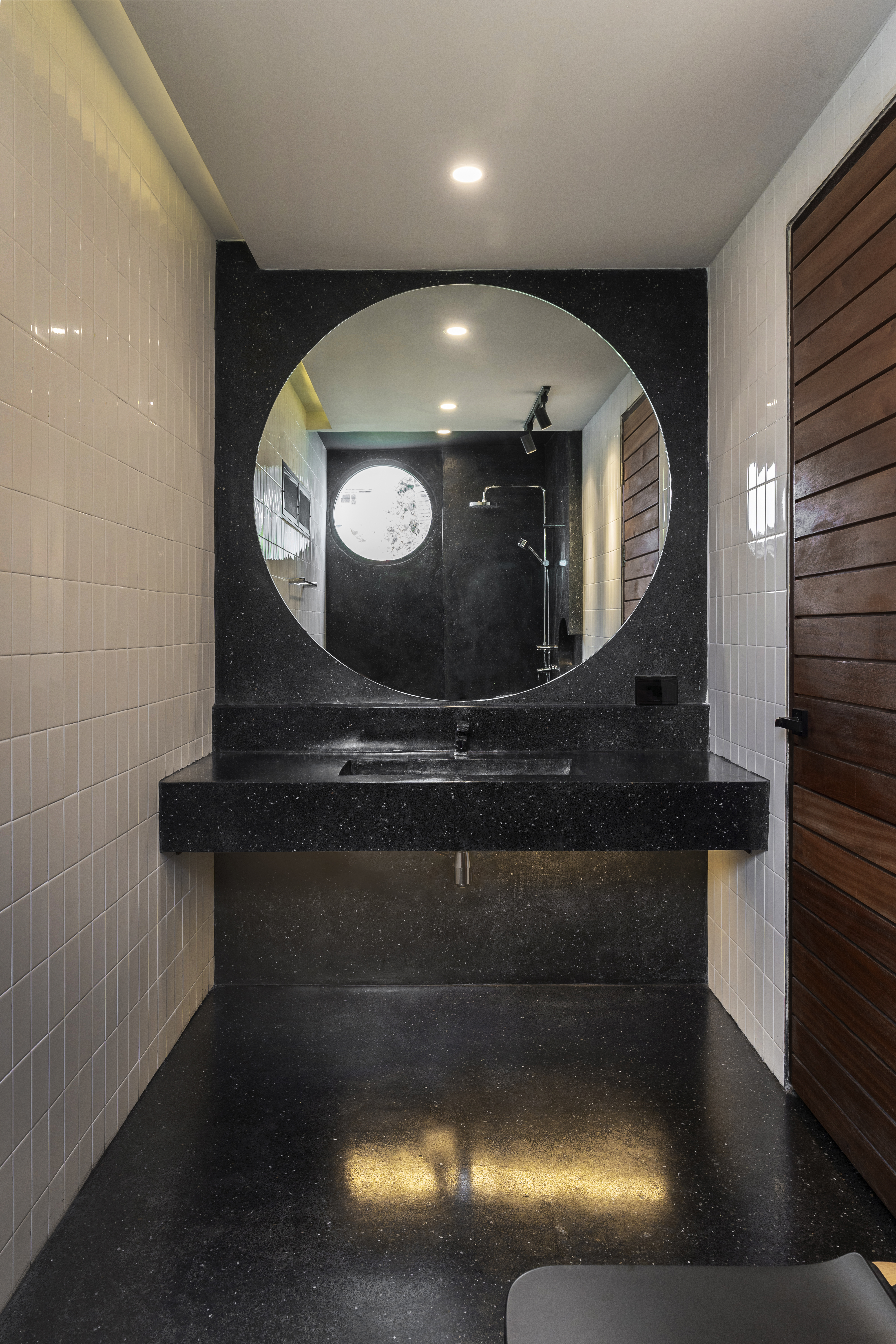 นอกจากการวางทุกฟังก์ชันให้ลงตัวแล้ว สถาปนิกยังนำกลุ่มอาคารเหล่านี้ มาสร้างความคอนทราสต์ระหว่างภายนอกและภายในโครงการ โดยวางโรงจอดรถสีดำไว้ด้านหน้า เพื่อใช้เป็นทางเข้าหลักที่กว้างขวาง สะดวกต่อการรับ-ส่งของ พร้อมกับวางอาคารโรงงานสีขาวด้านข้าง ทอดยาวไปยังออฟฟิศด้านหลัง ซึ่งทั้งสองพื้นที่นี้ถูกออกแบบให้ดูเรียบง่ายและปิดทึบจากภายนอก เพื่อช่วยสร้างความเป็นส่วนตัวให้กับผู้ใช้งาน รวมถึงส่งเสริมให้อาคารด้านในโดดเด่นขึ้น และเมื่อเดินผ่านประตูเข้ามา จะพบกับ Courtyard ตรงกลางที่โปร่งโล่ง พร้อมเผยตัวอาคารออฟฟิศที่เป็นหัวใจหลักของโครงการ