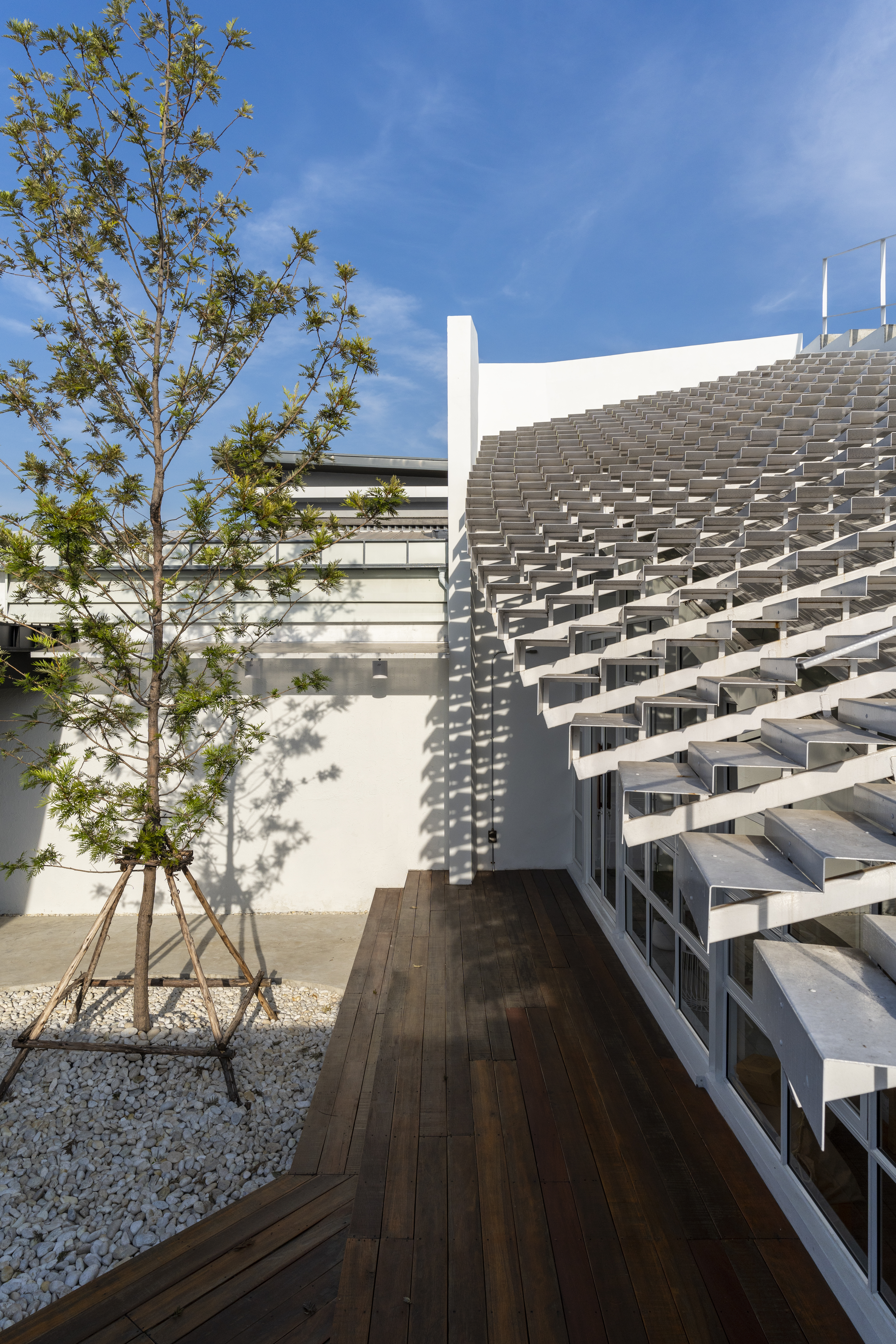 จากความตั้งใจอยากทดลองออกแบบสเปซใหม่ๆ ที่สร้างภาพจำแก่ผู้คนได้ตั้งแต่แรกเห็น นำมาสู่การผสานรูปแบบของบันไดเข้ากับรูปทรงอาคาร โดยเปลี่ยนหลังคาของอาคารกล่องสี่เหลี่ยมทั่วไป ให้กลายเป็น Slope บันไดที่ชวนสะดุดตา