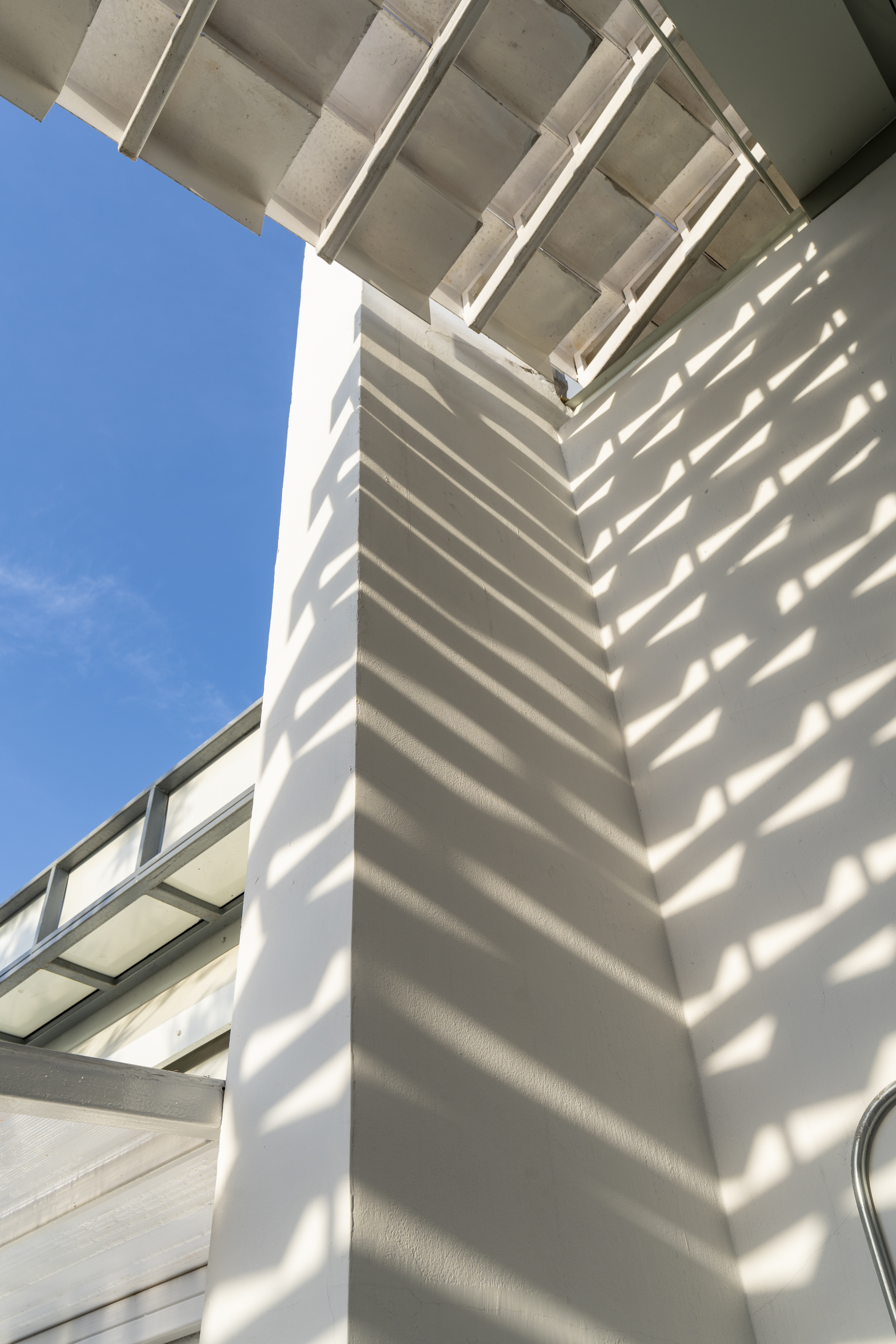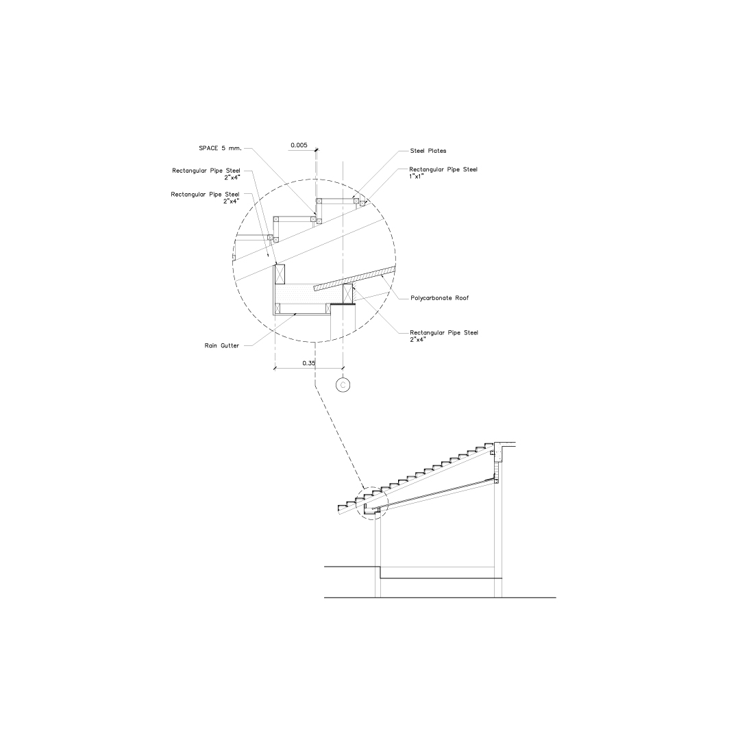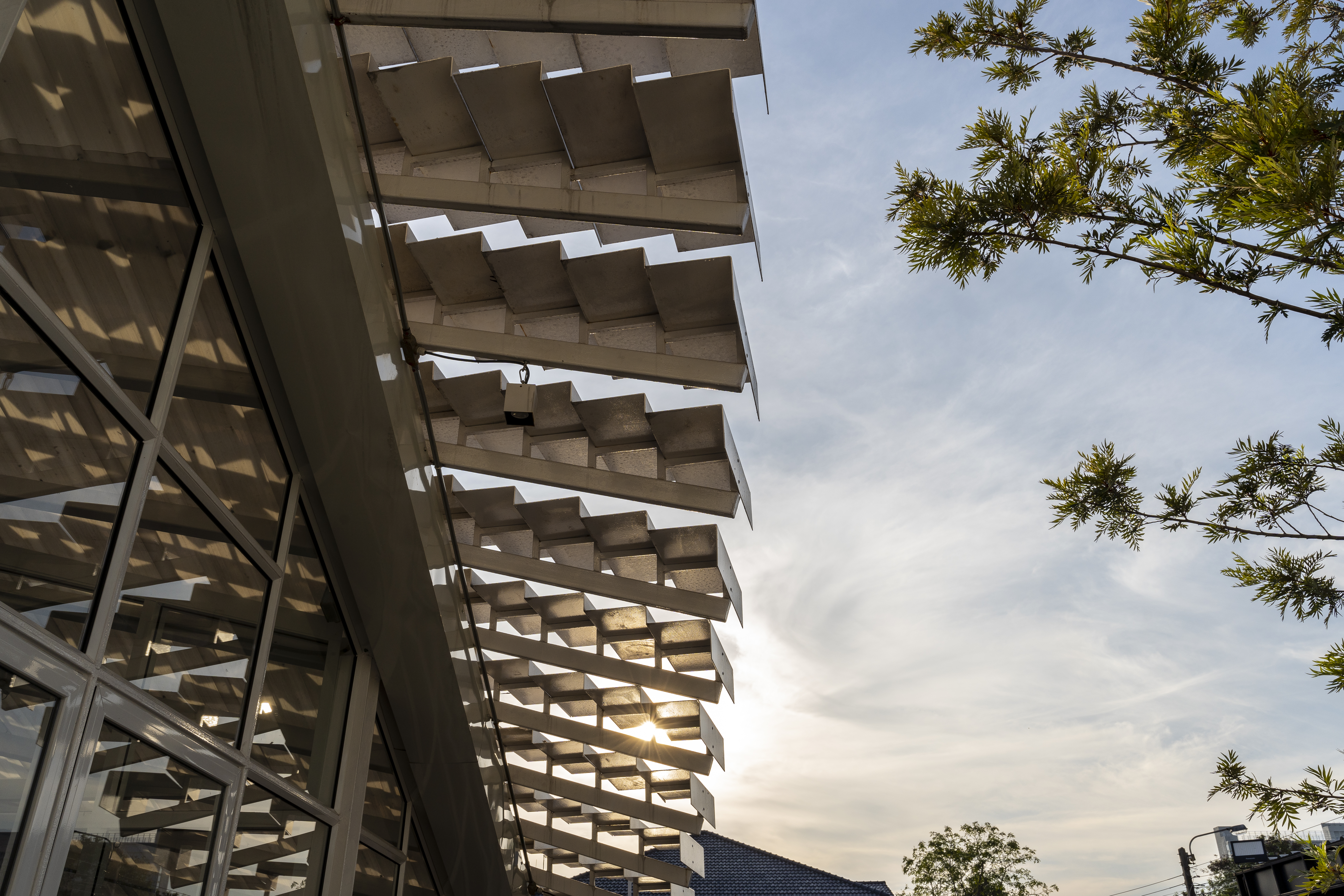 นอกจากฟาซาดที่ทำหน้าที่เป็นหลังคาในชั้นแรกแล้ว ยังมีหลังคาด้านล่างอีกชั้น ที่ปกคลุมด้วยแผ่นโพลีคาร์บอเนตชนิดขุ่น ซึ่งทำหน้าป้องกันอาคารให้ปลอดภัย แต่ในขณะเดียวกันก็กรองแสงแดดอ่อนๆ ลอดผ่านฟาซาดบันไดเข้าสู่ตัวอาคารได้ ทำให้บรรยากาศภายในอาคารมีชีวิตชีวามากขึ้น