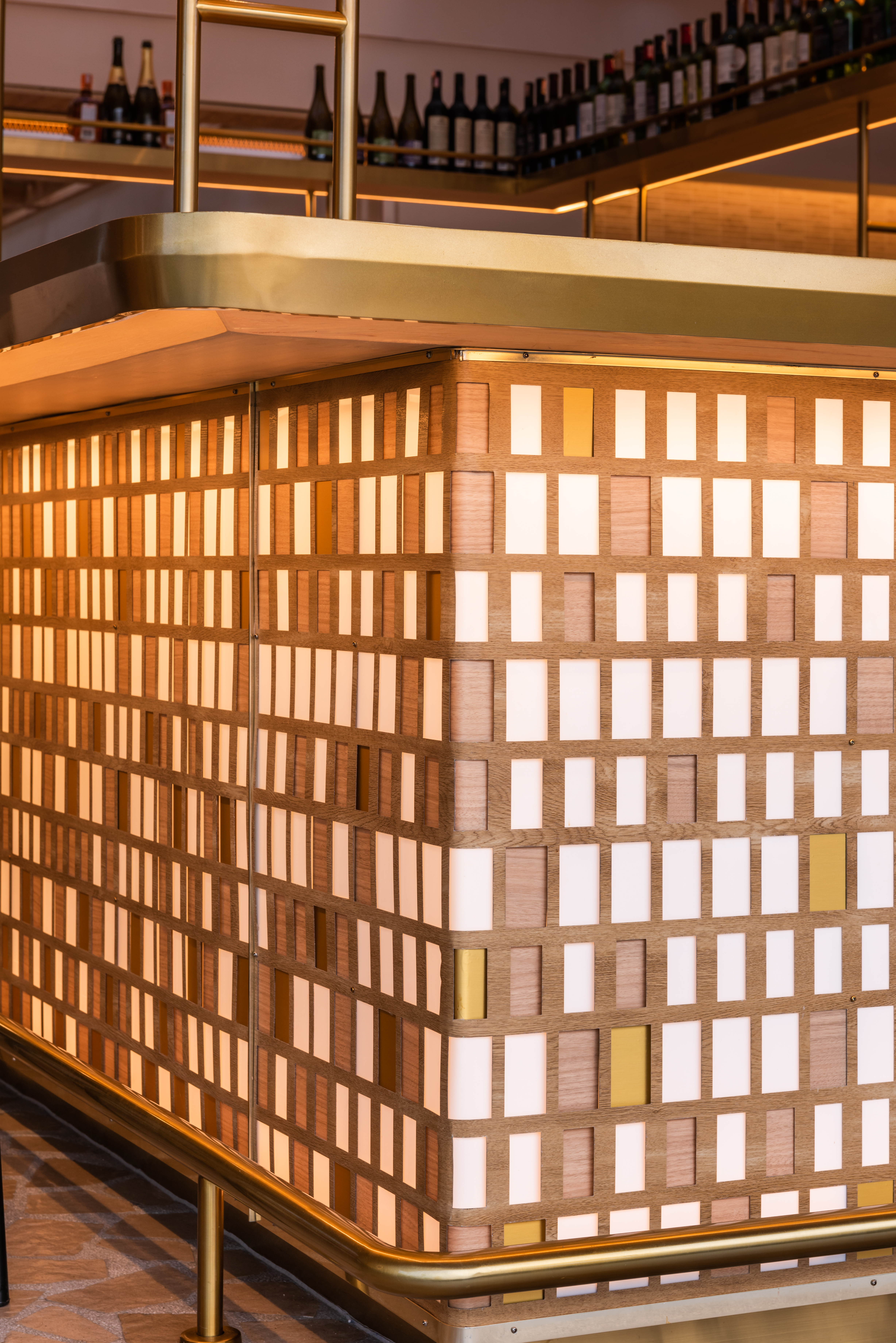 ไฮไลท์ที่น่าสนใจ คือบาร์ตรงกลางที่ได้แรงบันดาลใจจากโครงกระดูกงูเรือ ออกแบบให้มีแพทเทิร์นเป็นพิกเซล 4 วัสดุ ได้แก่ ลามิเนต อะลูมิเนียมลายไม้ ฟิล์มสีทอง และอะคริลิก พร้อมติดตั้งไฟส่องสว่างไว้ด้านหลังวัสดุเพื่อให้เวลากลางคืนเกิดแสงไฟระยิบระยับบนแพทเทิร์นหลากวัสดุ ซึ่งไม่ว่าจะมองมุมไหนก็สร้างความโดดเด่นได้เป็นอย่างดี
