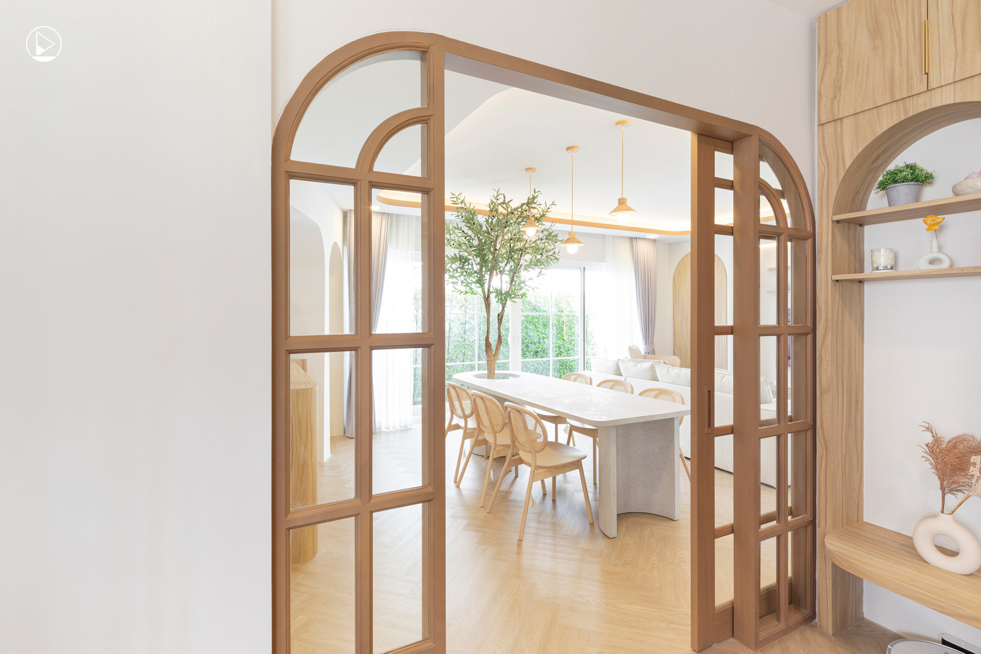 เพื่อให้บ้านมีมุมต่าง ๆ ที่น่าสนใจมากขึ้น ดีไซน์เนอร์กำหนดสเปซด้วยการนำเส้นสายโค้งเหล่านี้มาใช้ออกแบบ เช่น ซุ้มโค้งบริเวณห้องครัวที่เติมความสนุกด้วยการบิดแกนแนวตั้งให้เยื้องกัน จากเส้นสายระนาบเดียวจึงช่วยสร้างมิติให้สเปซนั้น ๆ น่าสนใจ หรือทางเข้าห้องครัวที่มีการไล่สีจากโทนเข้มมาสู่โทนอ่อนทำให้ซุ้มทางเข้ามีมิติที่ลึกมากขึ้น