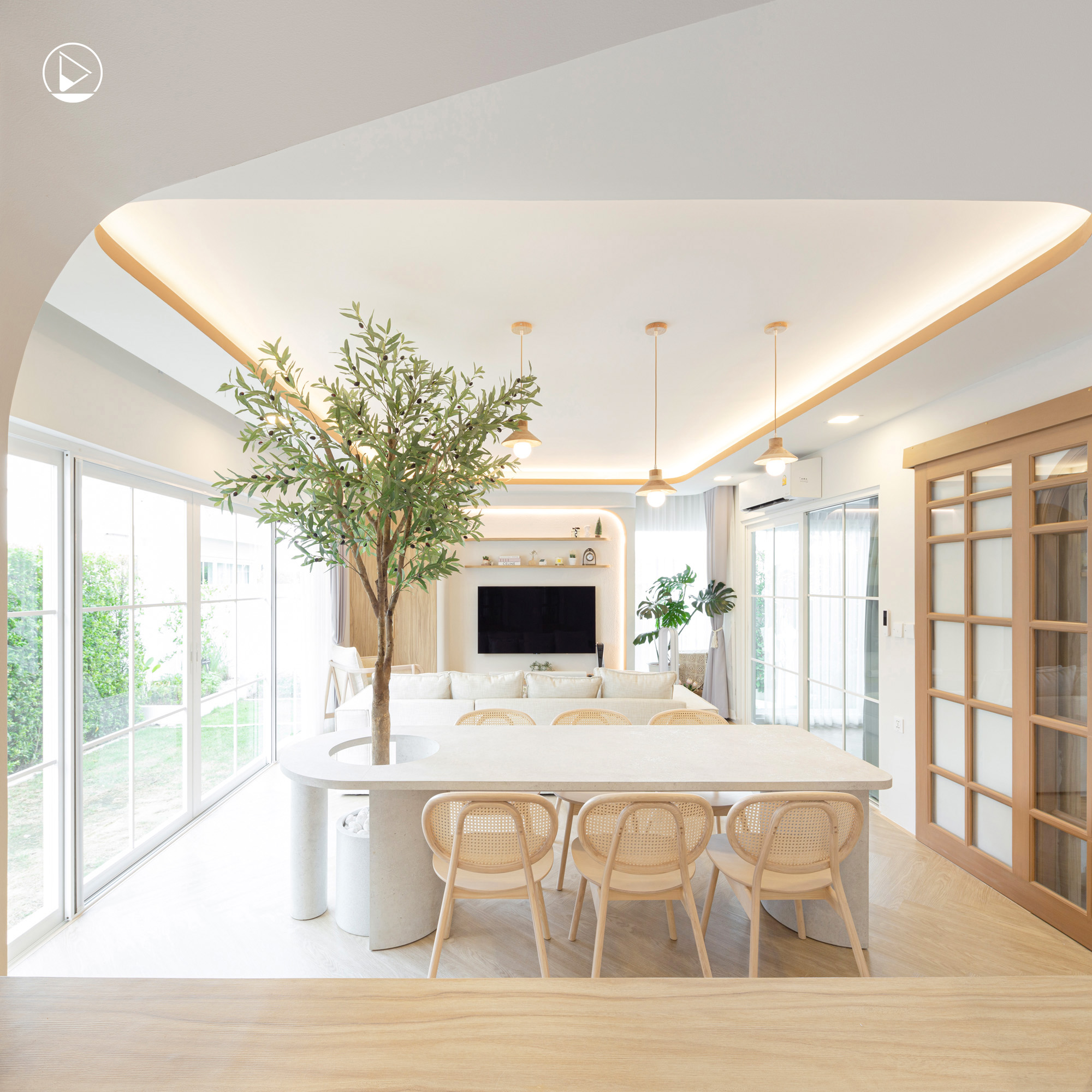 นอกจากนั้นเรายังเห็นเส้นสายโค้งมน ถูกนำไปใช้ในส่วนต่าง ๆ ของพื้นที่ภายใน ตั้งแต่ซุ้มประตูทางเข้าที่เป็นตัวแบ่งพื้นที่ระหว่างห้องนั่งเล่นและ Foyer ของบ้าน ซุ้มโค้งหน้าทีวีที่มีการใช้เส้นสายโค้งเพื่อเป็นแบคกราวด์ให้กับโซน และยังมีเส้นสายของงานออกแบบตู้ หรือฝ้าเพดานที่ยังโค้งล้อกันไปทั้งบ้าน