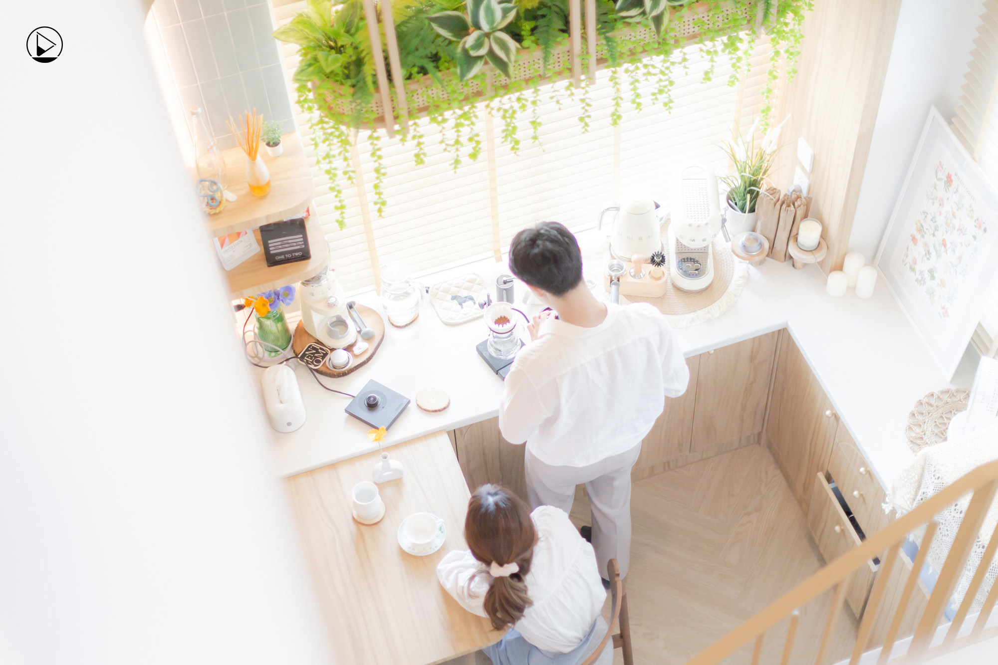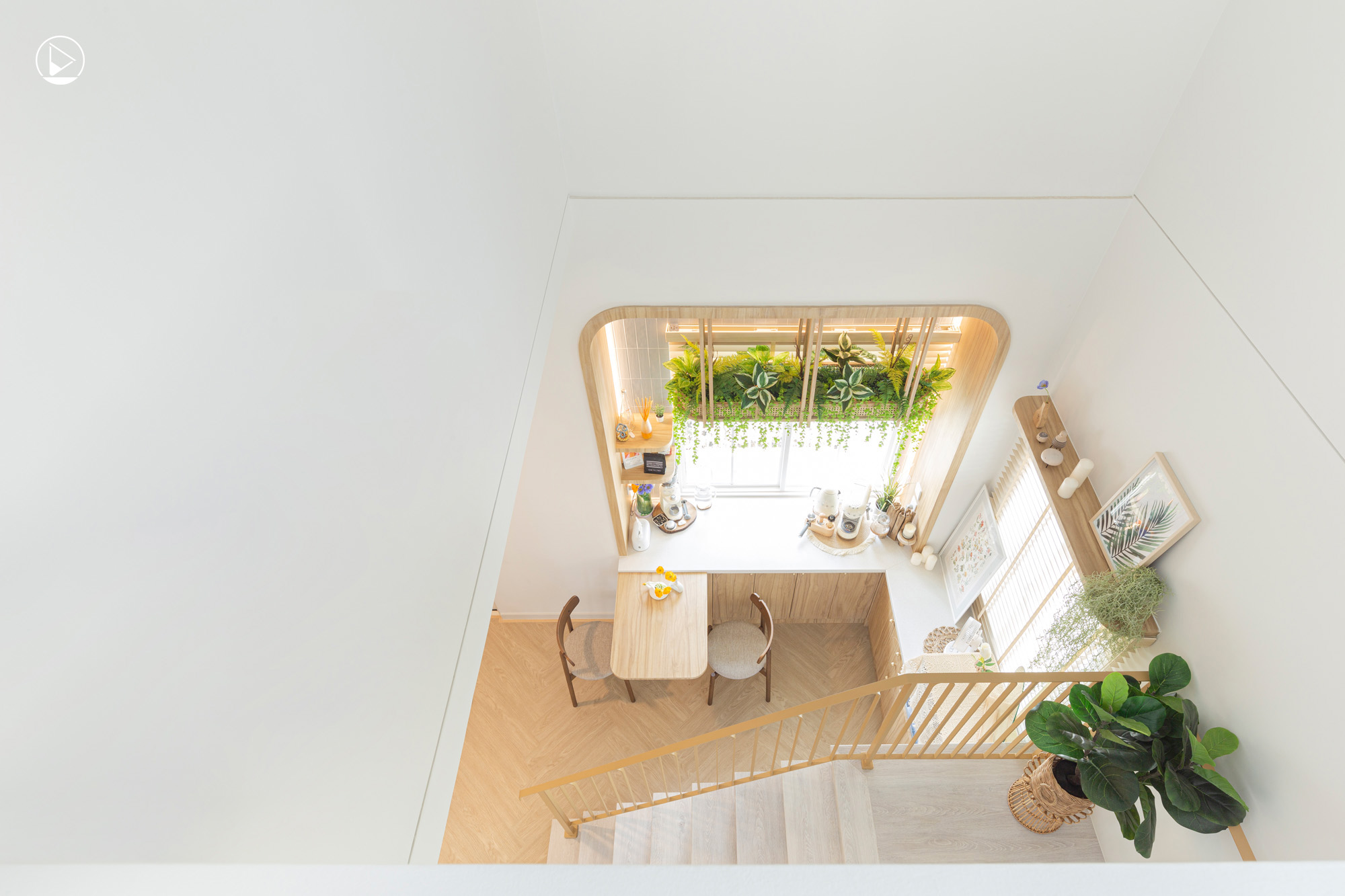 “เราคิดเรื่องมุมกล้องไปพร้อมกับฟังก์ชันที่เจ้าของเขาต้องการ เช่น คุณเอิร์ธชอบดริฟกาแฟ และในบ้านต้องมีมุมกาแฟ ตรงเคาน์เตอร์กาแฟ เราจะมาคิดว่า แดดมาทิศไหน หน้าต่างหันทางไหนที่จะทำให้เขาสามารถตั้งกล้องถ่ายได้แล้วสวยพอดี หรือซุ้มโค้งของครัวและซุ้มโค้งบริเวณทีวีที่สามารถเป็น background เวลาที่เขาถ่ายรีวิวได้จากทั้งสองมุม แม้แต่โต๊ะรับประทานอาหาร เราก็มองว่ามันต้องมีขนาดใหญ่พิเศษ เผื่อสำหรับรีวิวถ่ายสินค้าบนโต๊ะ อย่างตอน Render 3D เราเซ็ตมุมจำลองให้เขาเลยว่า ถ้าตั้งกล้องตรงนี้ มุมนี้ เขาจะเห็นอะไรบ้าง”
