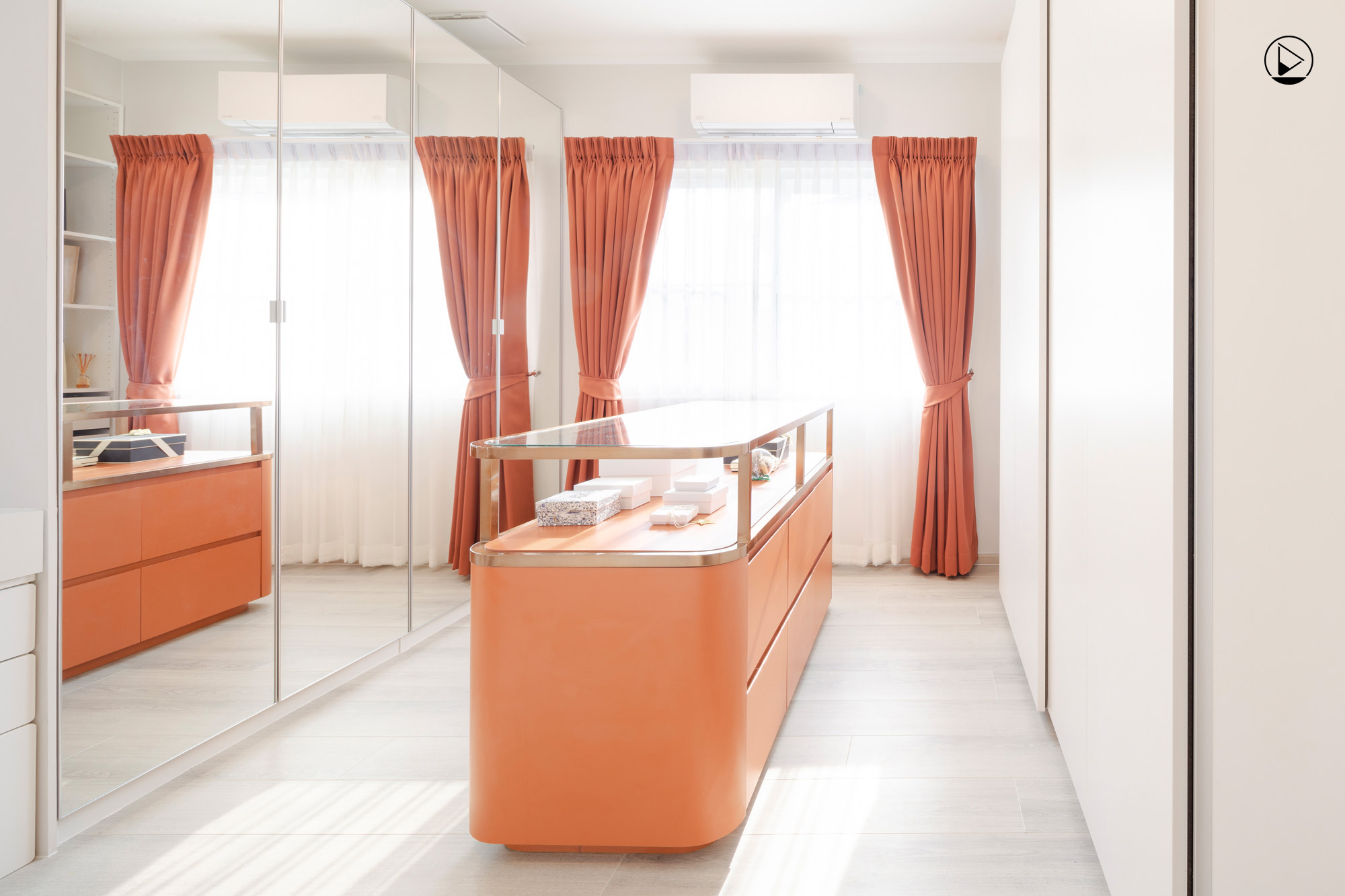 “ห้องแต่งตัวที่เราออกแบบพิเศษบริเวณชั้นสอง เขาต้องมีการถ่ายรูปให้สวยหรือบางทีต้องรีวิวเครื่องสำอาง เราจะให้เขาทำ Personal color ว่าเขาอยู่กับสีไหนแล้วขึ้น และสวย ซึ่งผลออกมาเป็นสีโทนส้มก่ำ ๆ เราเลยเอาตรงนั้นมาดีไซน์ให้กลายเป็นห้องแต่งตัวเขา เติมองค์ประกอบโค้งเข้าไปให้มันไปในทิศทางเดียวกับพื้นที่ชั้น 1”