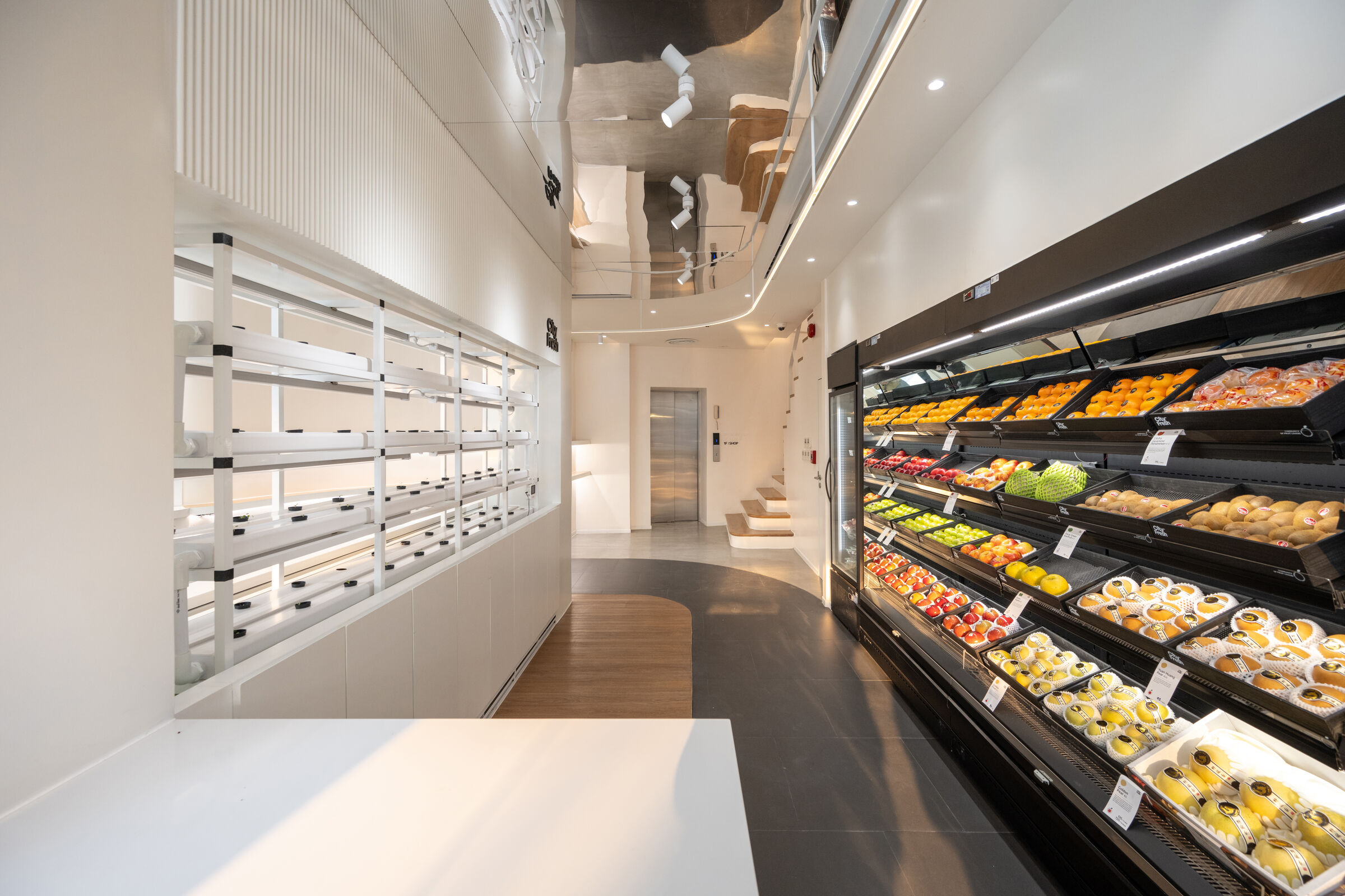 ซึ่งเมื่อมาถึงหน้าโครงการก็จะพบกับส่วนจัดแสดงผลไม้ด้านขวามือเป็นสิ่งแรก เหมือนเป็นเจ้าของบ้านที่คอยรับแขก และทักทายลูกค้า ส่วนซ้ายมือเป็นที่นั่งชั่วคราว และเคาท์เตอร์ต้อนรับ-สั่งอาหาร-คิดเงิน ตรงกลางคือที่ปลูกและจัดแสดงผักไฮโดรโปนิกส์ที่ปลูกเองสดๆ ให้เลือก ในส่วนนี้เส้นสายของตัวเฟอร์นิเจอร์จะนำสายตาให้ทอดยาวไปสู่ผลิตภัณฑ์ เพราะพื้นที่ค่อนข้างจำกัดจากผังเดิมที่เคยเป็นตึกแถวมาก่อน