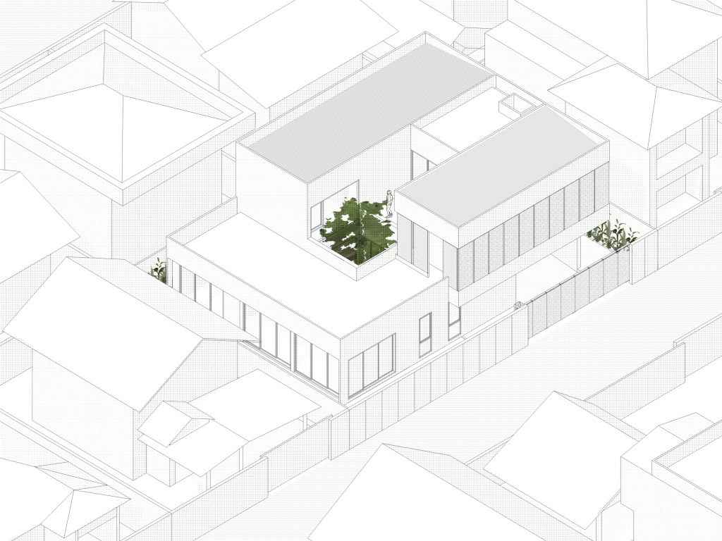 โดยที่กล่องปิดทึบนั้นเป็นผนังคอนกรีตฉาบเรียบสีขาวทำหน้าที่ในการกันแสงอาทิตย์จากทางทิศใต้ในขณะที่พื้นที่กลางบ้านนั้นได้เว้นช่องแสงขนาดใหญ่เพื่อปลูกต้นไม้ใหญ่ไว้กลางบ้านซึ่งทำหน้าที่ทั้งให้แสงเข้ามาในทุกส่วนของบ้านและให้ร่มเงาและความร่มรื่นแก่พื้นที่ภายในโดยมีพื้นที่ระเบียงชั้น2ที่มีขนาดใหญ่ที่หันหน้าเข้าสู่บ้านหลังเก่าทำหน้าที่เป็นทั้งหลังคาและพื้นที่ออกกำลังกายนอกบ้านทำให้สมาชิกในครอบครัวที่ทำกิจกรรมในบ้านเก่าและบ้านใหม่สามารถมองเห็นซึ่งกันและกันได้