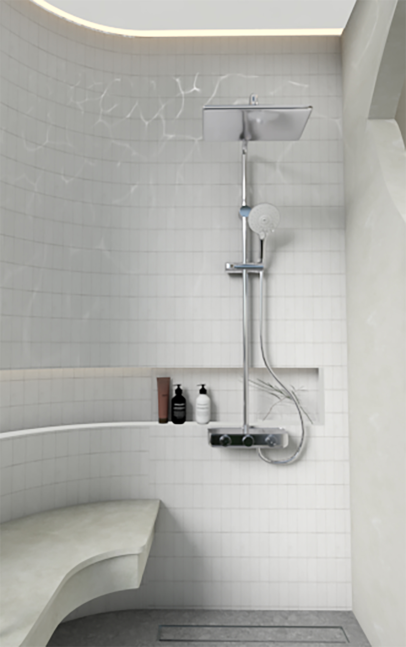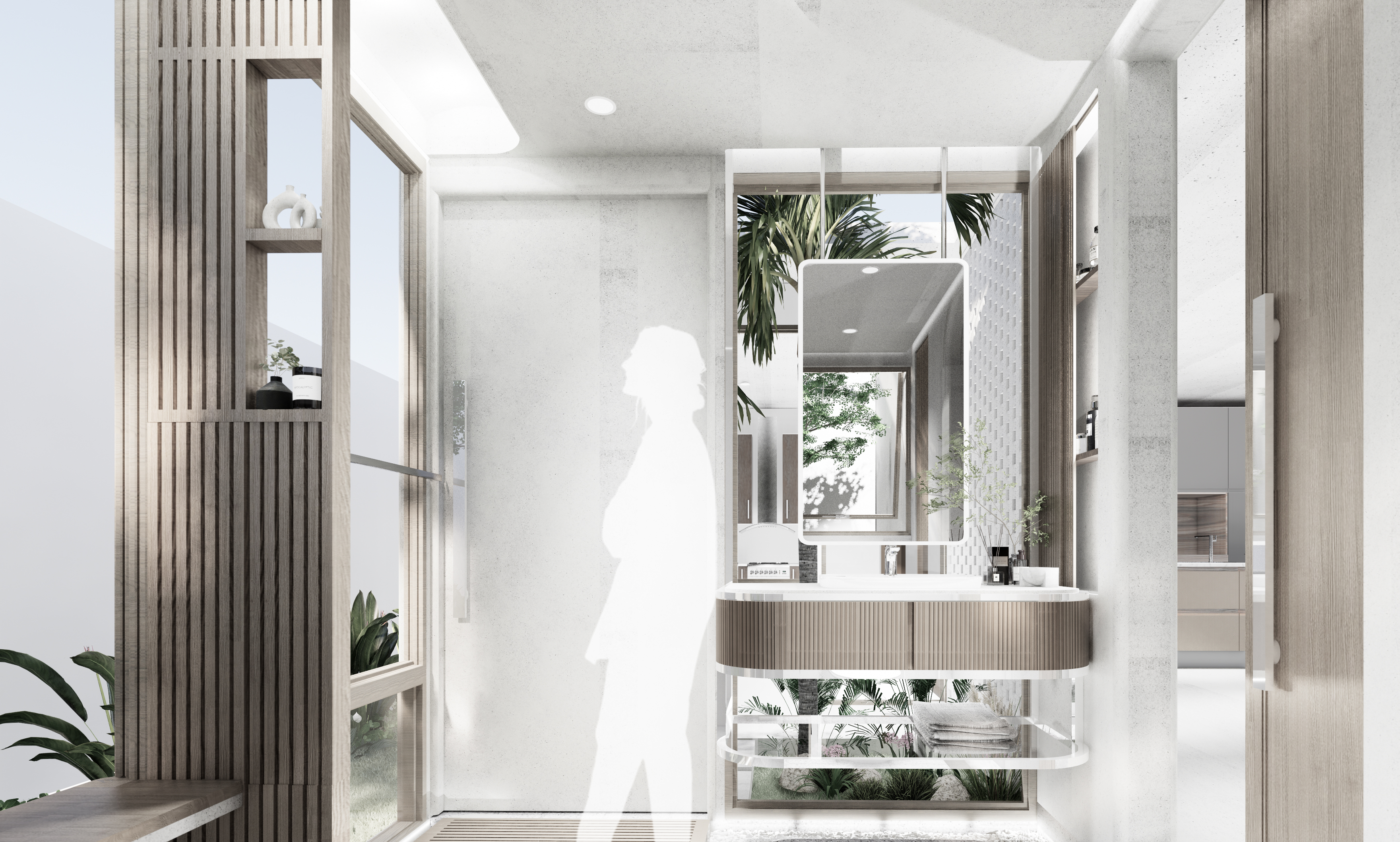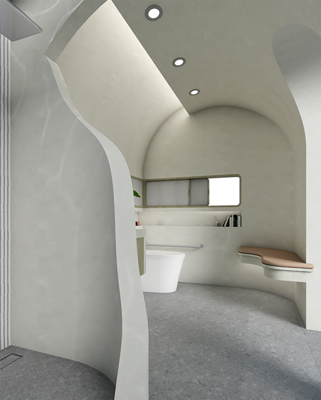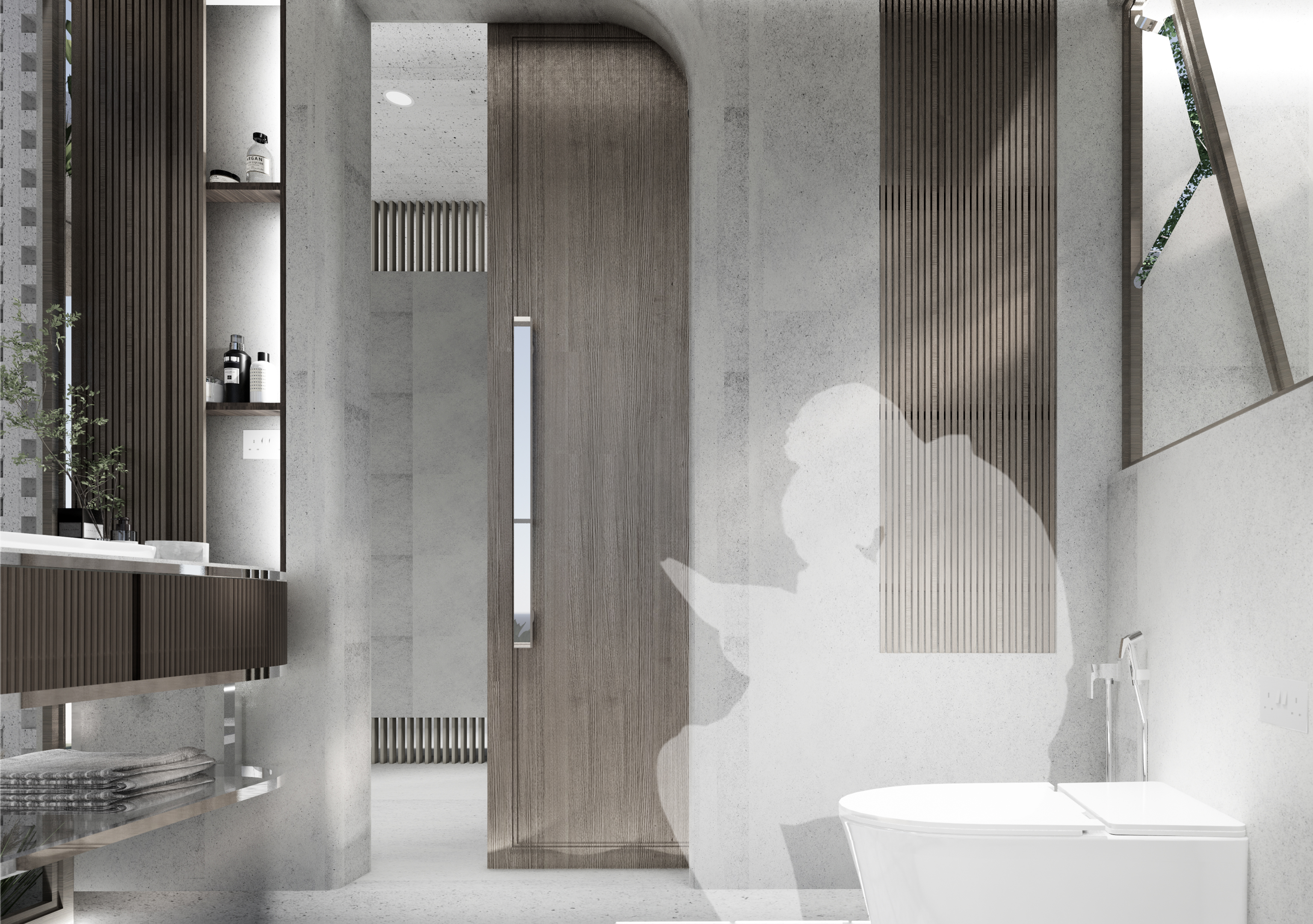 ผังห้องน้ำนี้แบ่งส่วนแห้งและส่วนเปียกอย่างชัดเจนเพื่อลดการเกิดอุบัติเหตุ ด้วยการจัดวางโซนอ่างล้างมือไว้ที่ใจกลาง และยังออกแบบเส้นสายโค้งมนพร้อมช้องเปิดบานใหญ่ที่โอบรับมุมมองและบริบทภายนอก ในโซนเปียกอย่างพื้นที่อาบน้ำมีช่องแสงด้านบนที่สร้างเอฟเฟกต์ของแสงเสมือนใต้ทะเลที่ช่วยเพิ่มความผ่อนคลาย และยังแทรกฟังก์ชันรางระบายน้ำกลืนไปกับพื้นห้องน้ำเพื่อความปลอดภัยสำหรับการใช้งานของเด็กและผู้สูงอายุ และยังมีฟังก์ชัน Built-in สำหรับที่นั่งอาบน้ำของผู้สูงอายุ