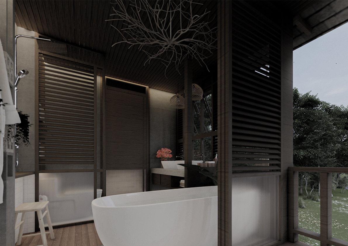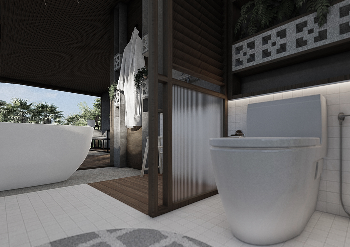 ห้องน้ำออกแบบให้มีความเป็นพื้นถิ่น โดยดึงเอาพฤติกรรมการใช้ชีวิตของชาวอีสานที่มีการใช้พื้นที่ Semi-outdoor สามารถมองเห็นกันได้และยังมีแสงธรรมชาติเข้าถึงตลอดทั้งวัน โดย Plan ของห้องน้ำนี้ เน้นการเชื่อมต่อกับฟังก์ชันอื่นๆ ในบ้าน โดยเราจะเห็นว่ามีทางเข้าสองทาง โดยมีทางเข้ารองเชื่อมต่อกับส่วนระเบียงภายนอกให้เป็นพื้นที่เดียวกัน ช่วยลดความเป็นห้องของห้องน้ำ ทลายกรอบเดิม ๆ และเปิดโอกาสในการใช้งานในช่วงเวลาที่ต้องการให้ห้องน้ำกลายเป็นพื้นที่ส่วนกลางหนึ่งของบ้าน