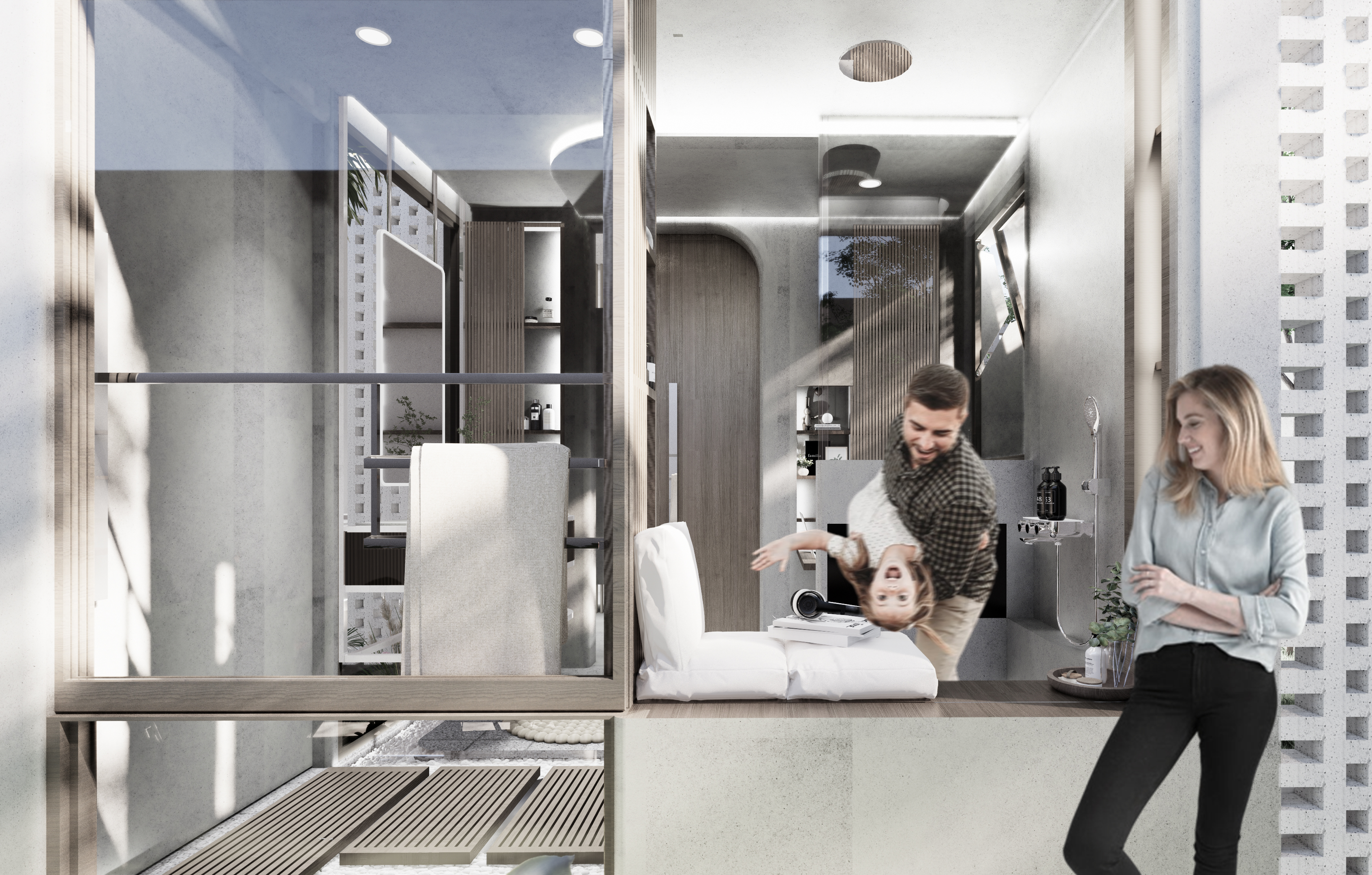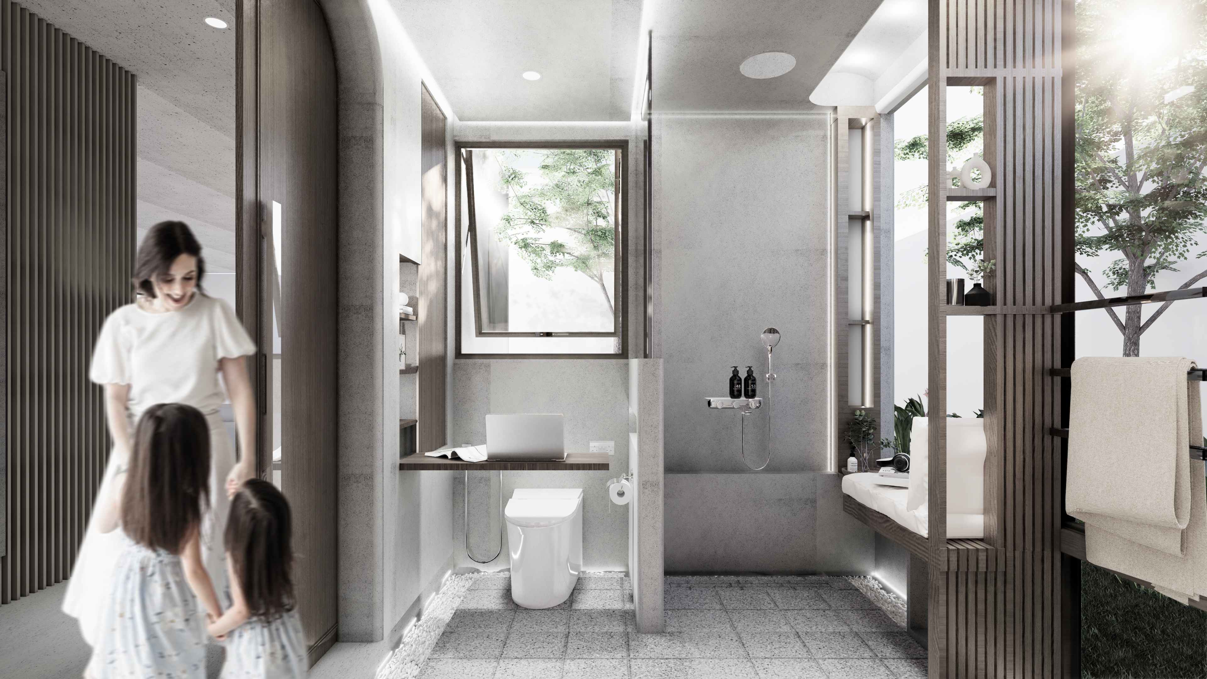 ในโซนอาบน้ำ มีการใช้ช่องเปิดขนาดใหญ่เชื่อมต่อกับบริบทภายนอก ซึ่งมุมมองที่เกิดขึ้นยังช่วยเพิ่มบรรยากาศให้ห้องน้ำ และเพิ่มโอกาสสร้างปฏิสัมพันธ์กับสมาชิกครอบครัวที่ใช้งานพื้นที่ภายนอก แต่ในขณะเดียวกันก็สามารถเลือกเปิด-ปิดช่องเปิดนี้ได้ผ่านกระจกฟิล์มฝ้าที่รองรับในเวลาที่สมาชิกต้องการใช้ห้องน้ำอย่างเป็นส่วนตัว และยังกิมมิคเล็ก ๆ อย่างเฟรมไม้ที่ซ่อนฟังก์ชันรองรับการใช้งานแบบนั่งอาบสำหรับผู้สูงอายุ หรือสามารถใช้เป็นพื้นที่นั่งพักผ่อนตอนที่ไม่มีการใช้งานในพื้นที่ “สำหรับไลฟ์สไตล์ในการใช้ห้องน้ำของเราเอง เรามักจะทำกิจกรรมหลาย ๆ อย่างในห้องน้ำ เราเลยอยากออกแบบห้องน้ำที่รองรับการใช้งานที่หลากหลาย ไม่ใช่แค่การขับถ่าย หรือแค่อาบน้ำ”