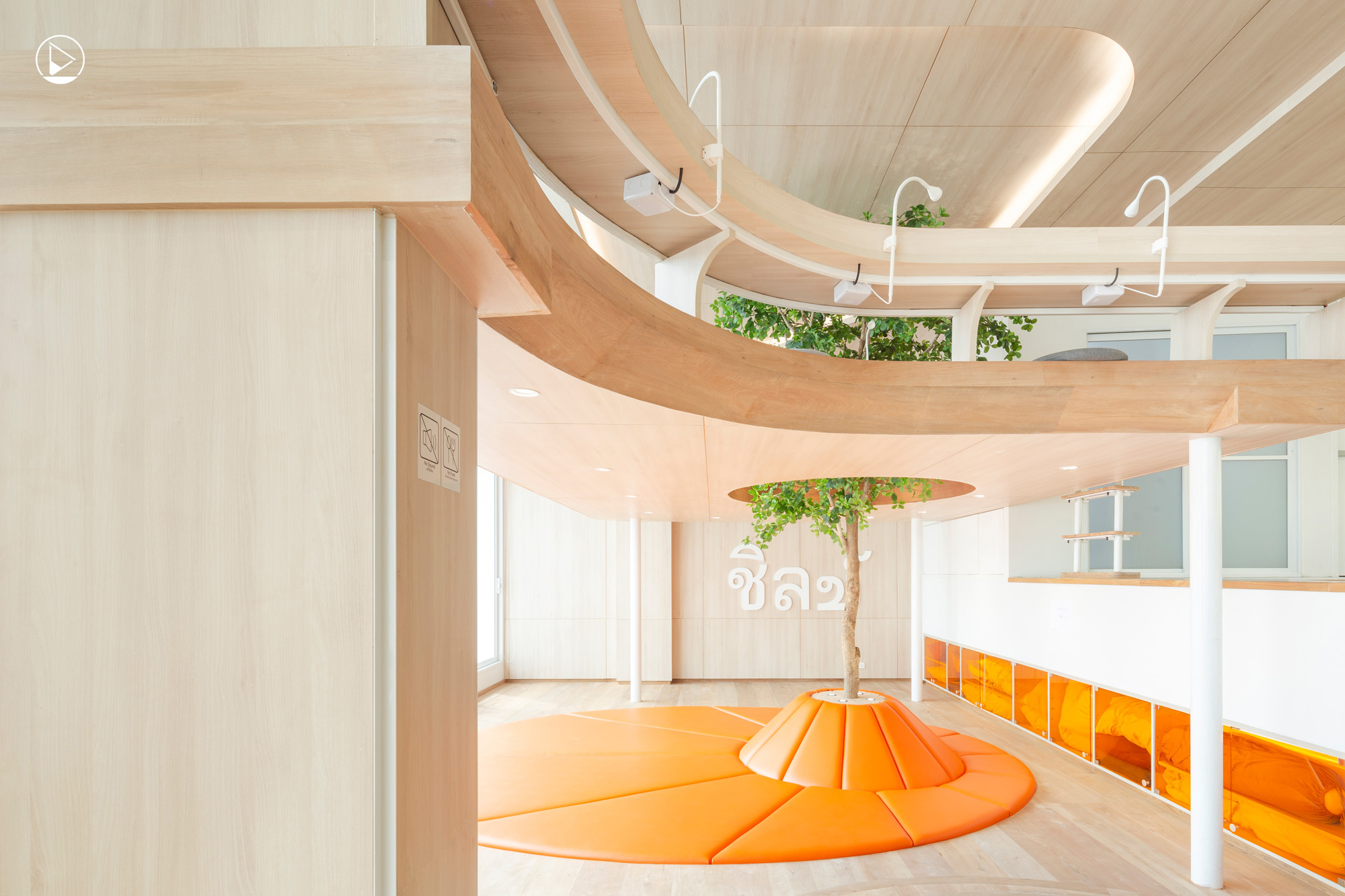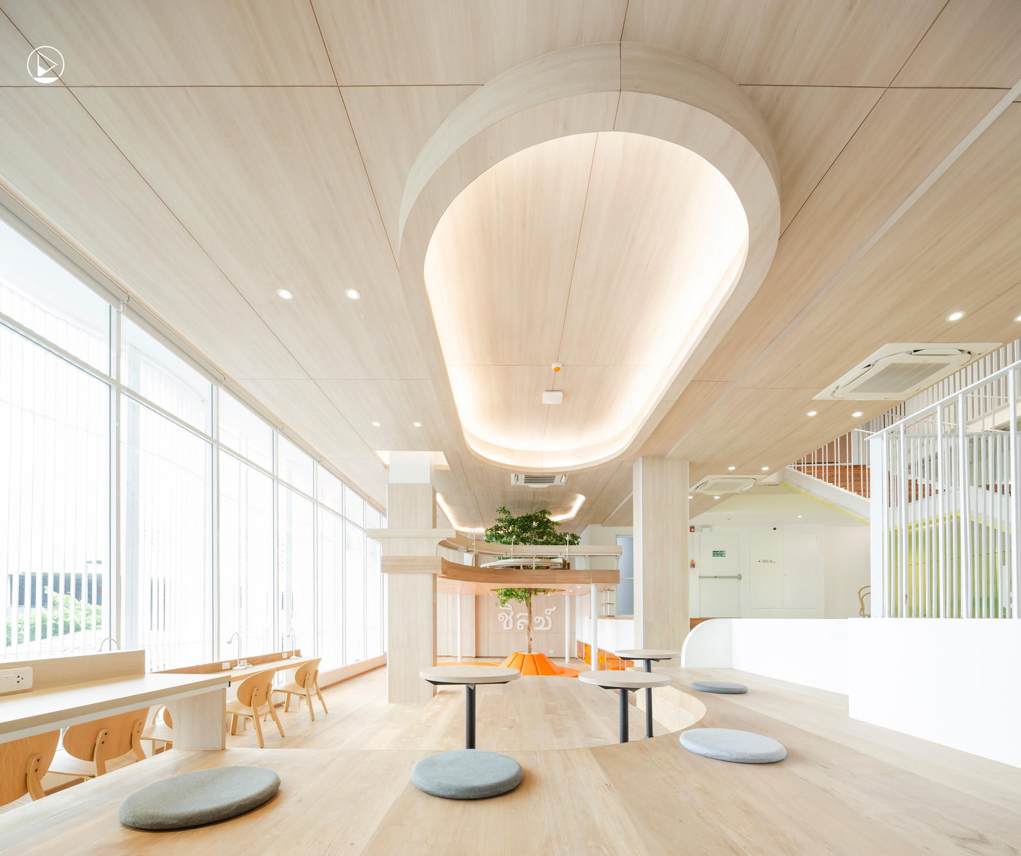 เนื่องจากต้องการให้ได้บรรยากาศความเป็น Living Space มากกว่าเป็น Working Space โซนที่เจอได้ถัดไปทางฝั่งด้านหน้าของอาคารจึงเป็นโซนชิลล์และเล่นที่เปลี่ยนบรรยากาศของงานดีไซน์ทำให้ดูสนุกขึ้น อย่างการเปลี่ยนไปใช้ไม้ตะแบกที่ทางเจ้าของเก็บไว้มาเป็นวัสดุหลักในการใช้กรุผิว เพื่อสร้างความรู้สึกรีแล็กซ์ เป็นกันเองมากขึ้น