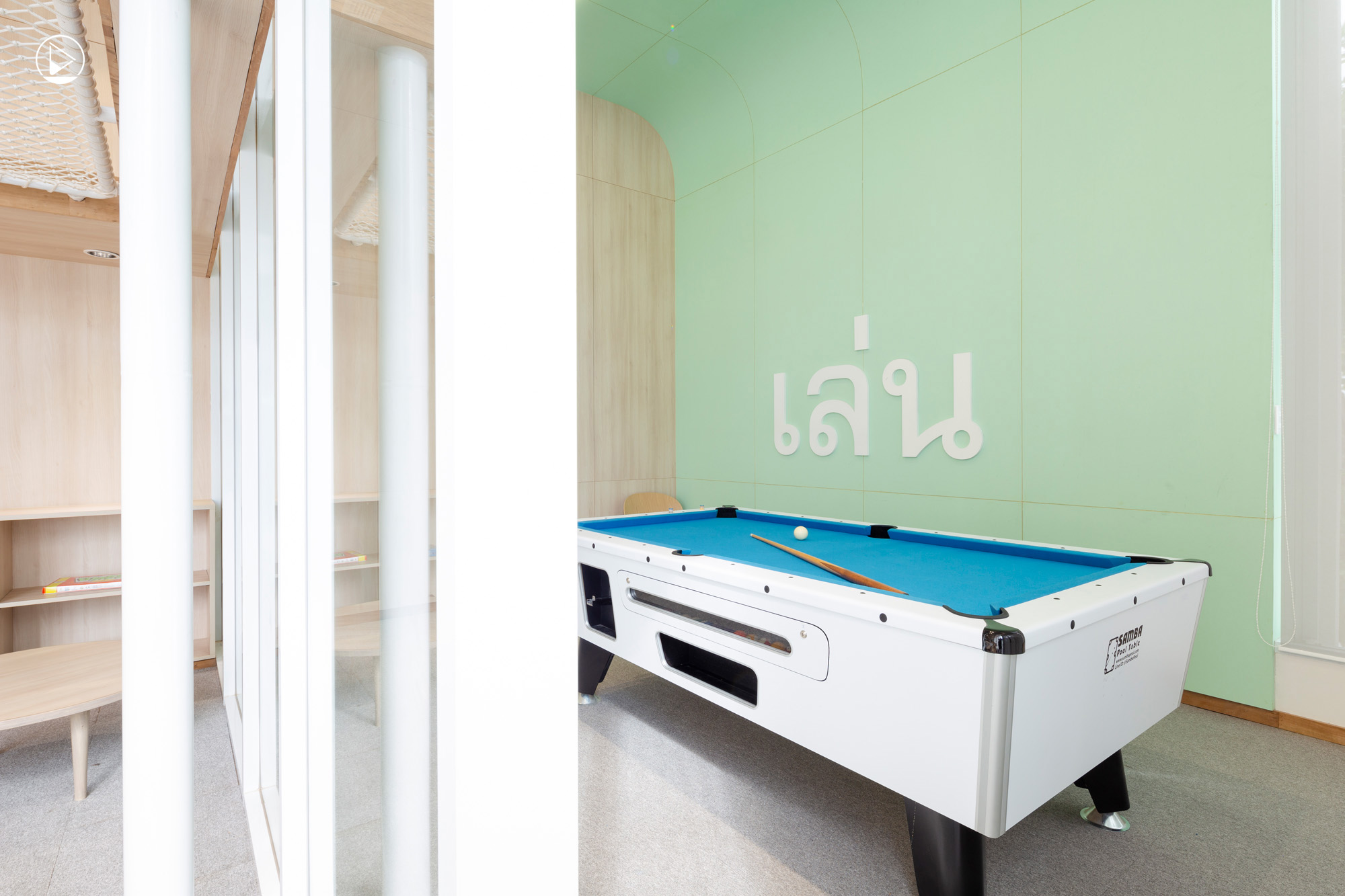 บริเวณโซนชิลล์ มีการดีไซน์เป็นบ่อหมอนให้คนใช้บริการสามารถมาพักผ่อนในอิริยาบถต่างๆ ได้ค่อนข้างหลากหลาย ถัดเข้าไปด้านในเป็นโซนเล่น ที่มีฟังก์ชันเป็นที่นั่งเล่นบอร์ดเกมส์ มีโต๊ะพูลที่กั้นเป็นห้องเพื่อป้องกันเรื่องเสียง ซึ่งในโซนเหล่านี้จะประกอบไปด้วยการนั่งที่หลากหลาย อย่างการนั่งพื้น สเกลเก้าอี้ที่เตี้ยกว่า สร้างความรู้สึกสบายและชิลที่มากกว่า และยังมีการออกแบบชั้นลอยในลักษณะตาข่าย สามารถปีนป่ายไปนั่งเล่น และยังทำให้เกิดความรู้สึกเชื่อมต่อกันระหว่างพื้นที่ในทางตั้งอีกด้วยนั่นเอง
