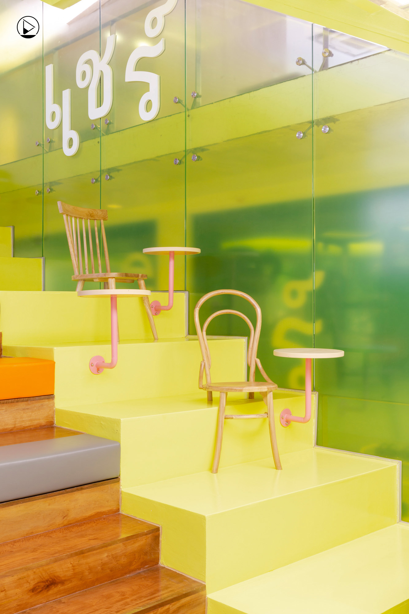 “เรื่องสีสันที่เอามาใช้ เราเอามาจากความเป็นย่าน ซึ่งตอนนั้นเราไปเดินในย่านอิสรภาพแล้วรู้สึกว่าย่านนี้ดูมีชีวิตชีวาดีนะ มีสีสันที่ดูหลากหลาย เราเลยใช้สีสดๆ สีนีออน เข้ามาเน้นแต่ละ Space จับคู่อยู่ด้วยกัน เพื่อให้มันรู้สึกเข้าถึงง่าย และดูเป็นกันเอง” คุณกานต์เล่า