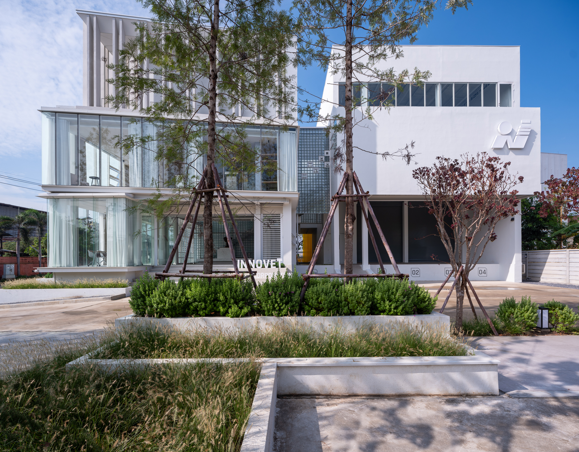 สถาปนิกไม่ใช้ระบบปรับอากาศกับพื้นที่ส่วนกลาง แต่เลือกใช้ช่องเปิดเป็น Modular ที่สอดคล้องไปกับรูปด้านอาคาร เพื่อประหยัดพลังงาน และ ให้อากาศถ่ายเท ให้ความรู้สึกตากอากาศ แก่ผู้ใช้งาน อาคารใช้วัสดุเป็นบล็อกแก้วเพื่อต้องการนำแสงเข้าสู่ตัวอาคาร และ เป็นวัสดุที่ไม่ใสเกินไปจนมองเห็นภายในทุกอย่าง เสริมความโมเดิร์นให้กับตัวอาคาร บริเวณออฟฟิศ และ ส่วนกลาง ไม่ใช่แค่การใช้เป็น Boundary แต่บล็อกแก้วเหล่านี้ยังใช้ทำพื้น บันได และ ที่นั่ง ส่วนของบล็อกแก้วยังถูกนำไปใช้กับส่วนอื่นๆของอาคาร เช่น ฝ้าเพดาน ช่องเปิดต่างๆ เพื่อให้พื้นที่ภายในอาคารมีทิศทางเดียวกันกับภายนอกอาคาร ส่วนบริเวณที่มีคนเข้าไปใช้งาน สถาปนิกใช้ไม้เข้ามาตกแต่งเพื่อให้ความรู้สึก อบอุ่น ทำให้บรรยากาศเหมือนบ้านพักตากอากาศ