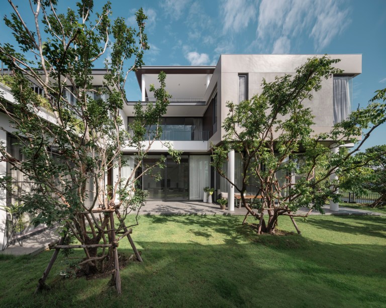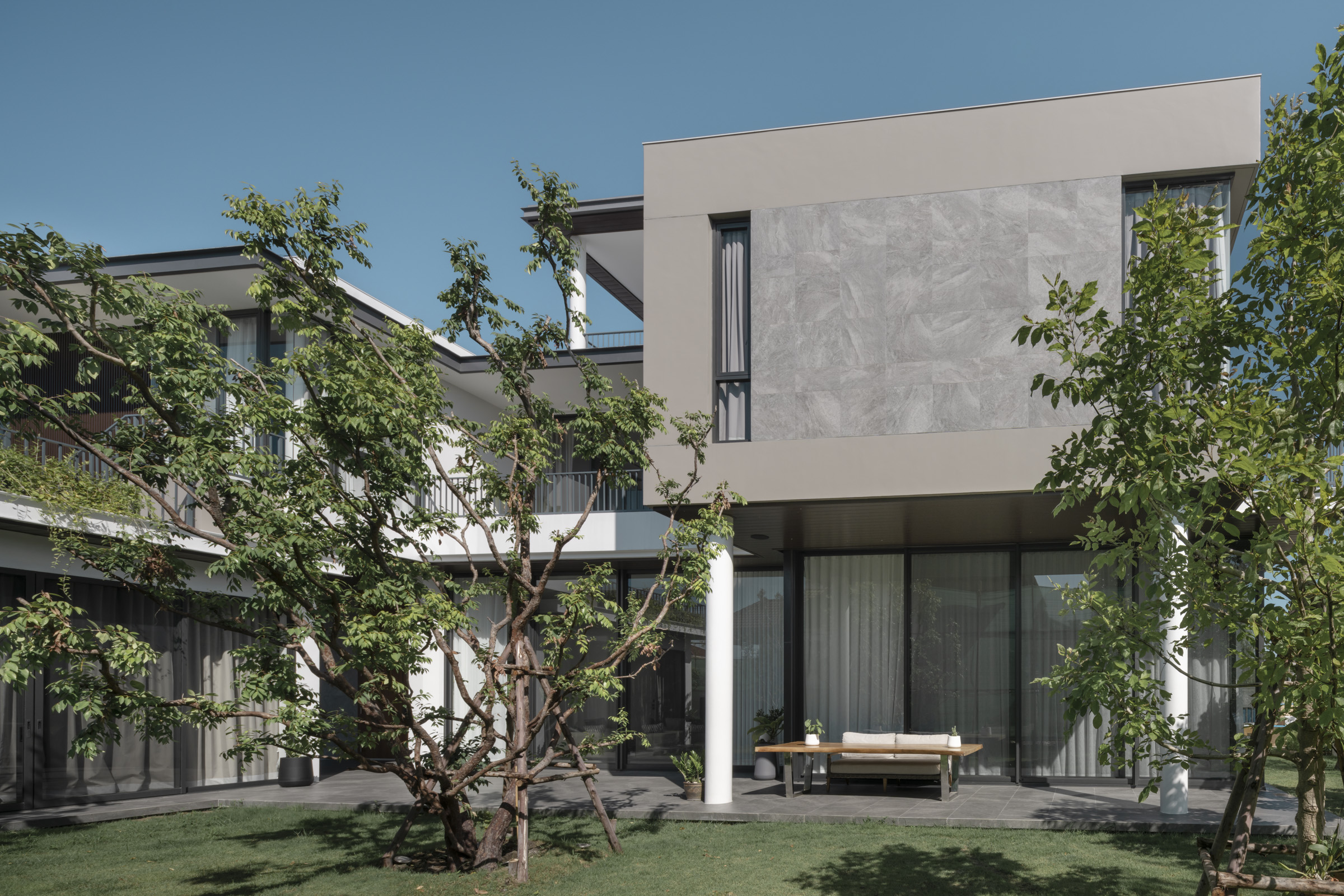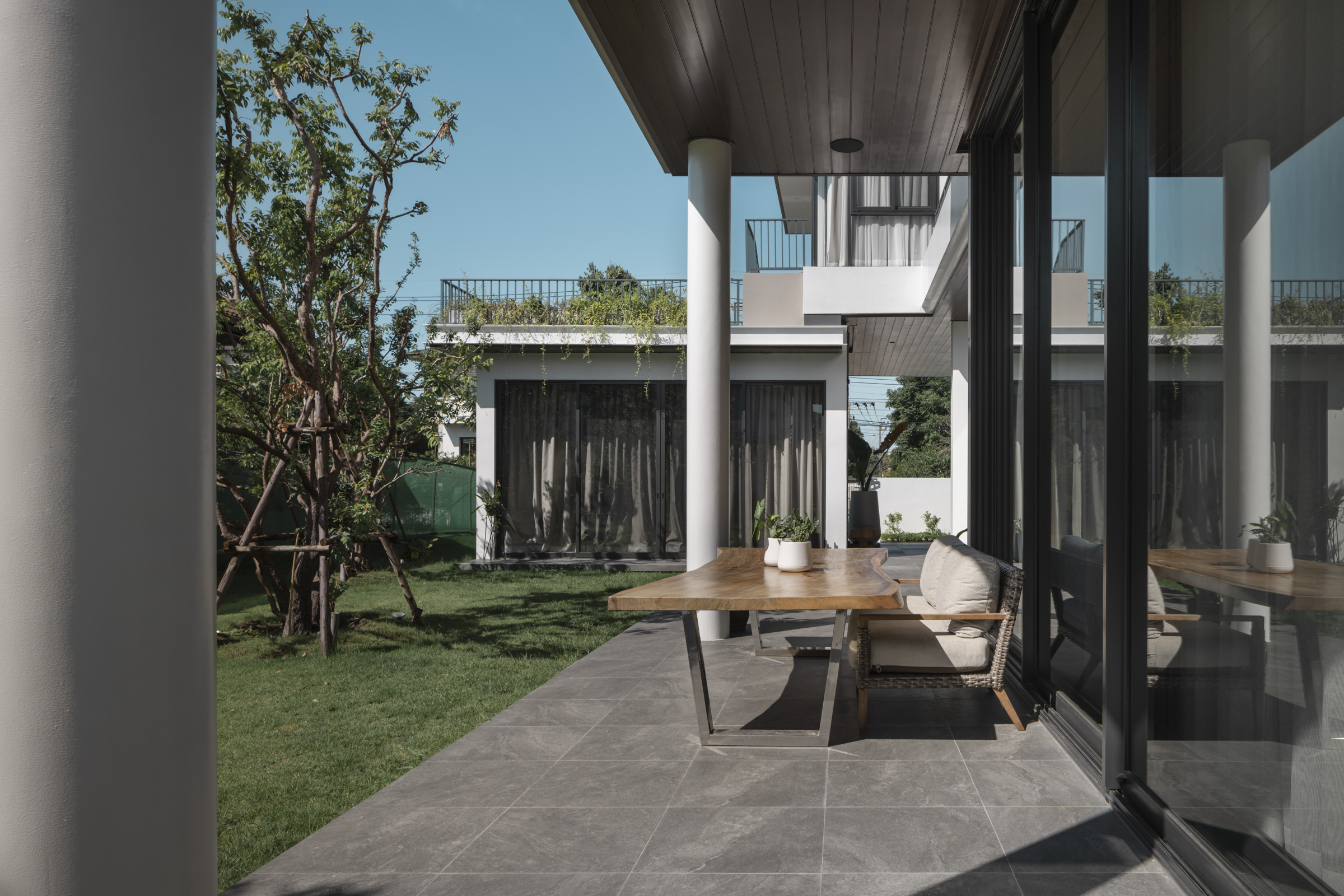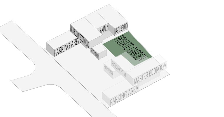 บริเวณที่ว่างระหว่างบ้านทั้งสองหลังกลายเป็นพื้นที่ตำแหน่งสำคัญที่ทำหน้าที่เป็นดั่งตัวเชื่อมสายใยความอบอุ่นให้กับครอบครัวหลากเจเนอเรชั่นครอบครัวนี้ ด้วยอุปนิสัยรักการเชิญชวนญาติพี่น้องและผองเพื่อนมาร่วมสังสรรค์ที่บ้าน การออกแบบให้อาคารทั้งสองหลังหันหน้าประกบกันจนเกือบจะเป็นตัว C ที่สมบูรณ์ก็สร้างความเป็นส่วนตัวให้กับผู้ใช้งานที่พบปะกันอยู่กลางบ้านได้เป็นอย่างดี