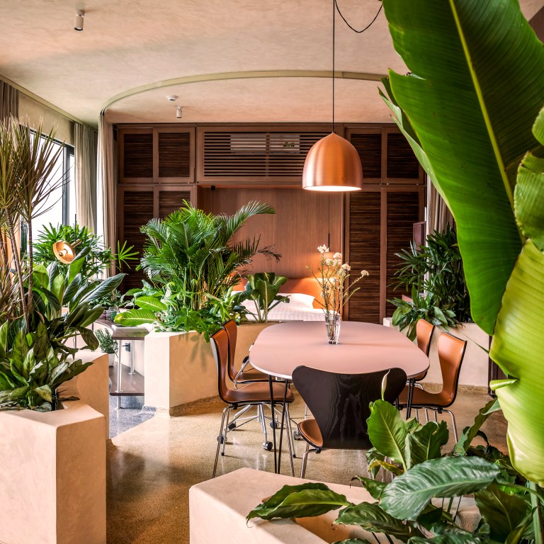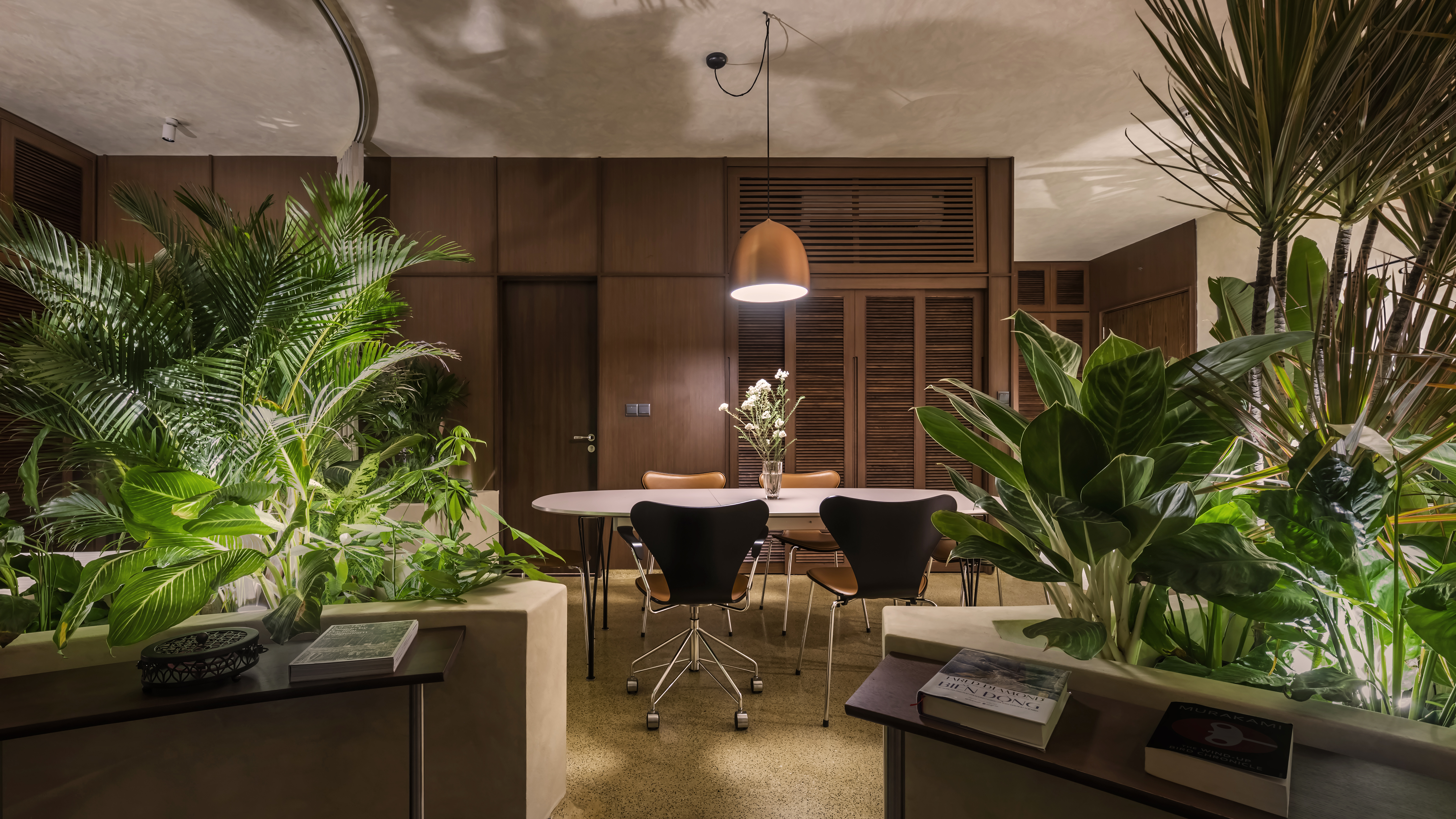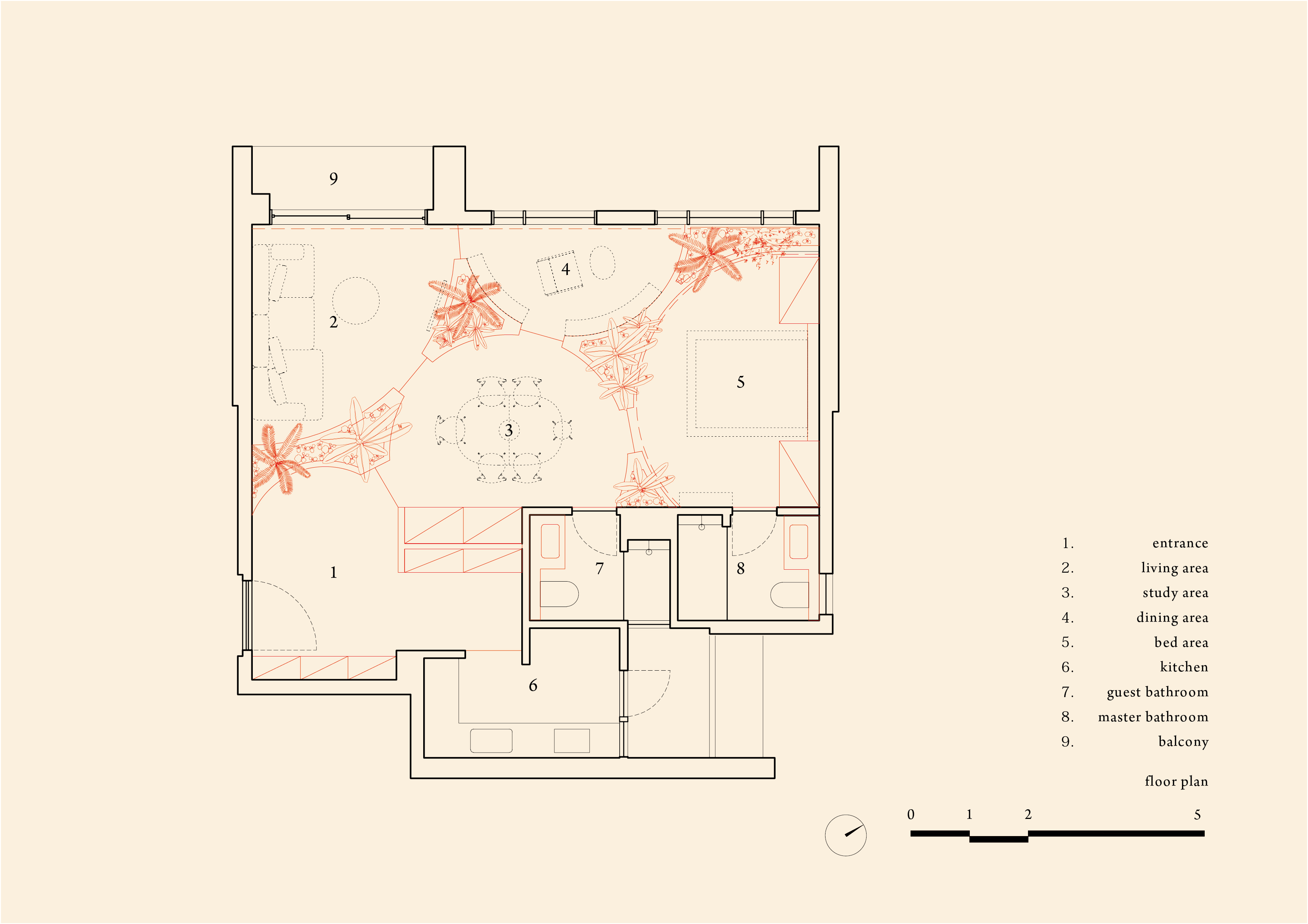 The furniture is categorized into five distinct functional zones: entrance, living, dining, study, and sleeping areas. Each zone can be easily distinguished by the floor’s color and the borderlines created by planter boxes for tropical indoor greenery.