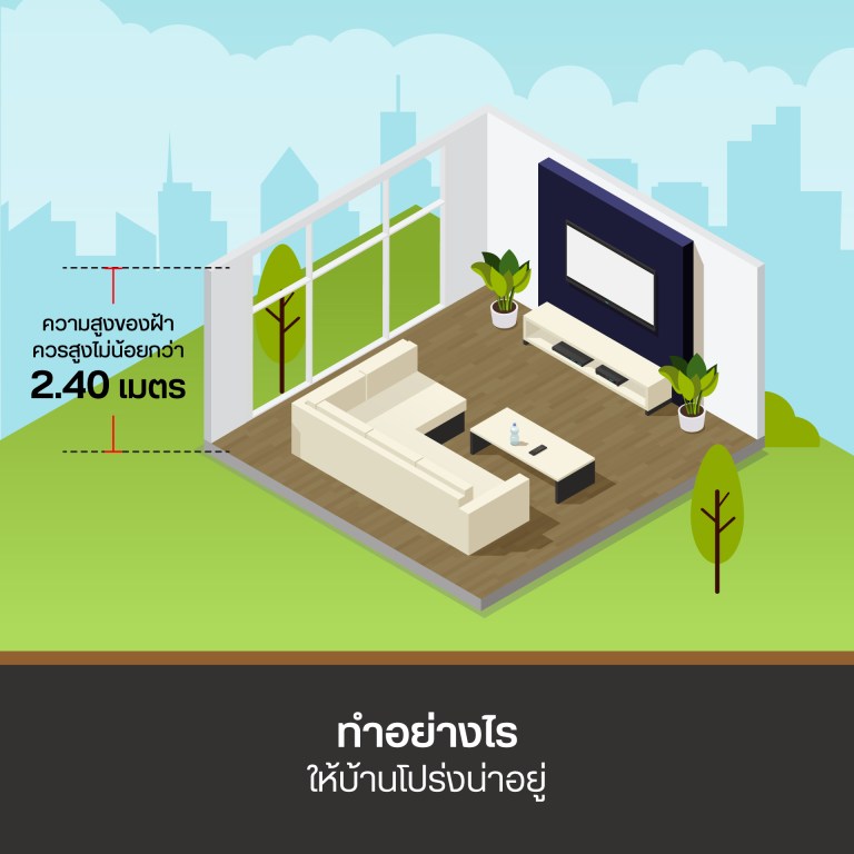 ความสูงของเพดานส่งผลต่อความรู้สึกในการอยู่อาศัยของผู้อยู่อาศัย หากมีความเตี้ยไปอาจส่งผลให้ผู้อยู่อาศัยรู้สึกอึดอัด หากมีความสูงที่มากเกินไปอาจเป็นปัจจัยสิ้นเปลืองพลังงานจากเครื่องปรับอากาศ ควรเผื่อความสูงของเพดานไว้ที่เท่าไหร่? ความสูงของฝ้าโดยทั่วไปปกติควรสูงไม่น้อยกว่า 2.40 เมตร(วัดจากระดับพื้นถึงท้องฝ้า) ซึ่งเป็นความสูงที่ไม่ทำให้รู้สึกอึดอัด หรือถูกกดทับ