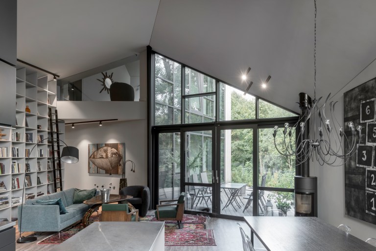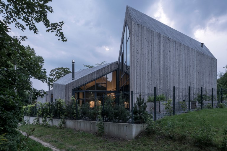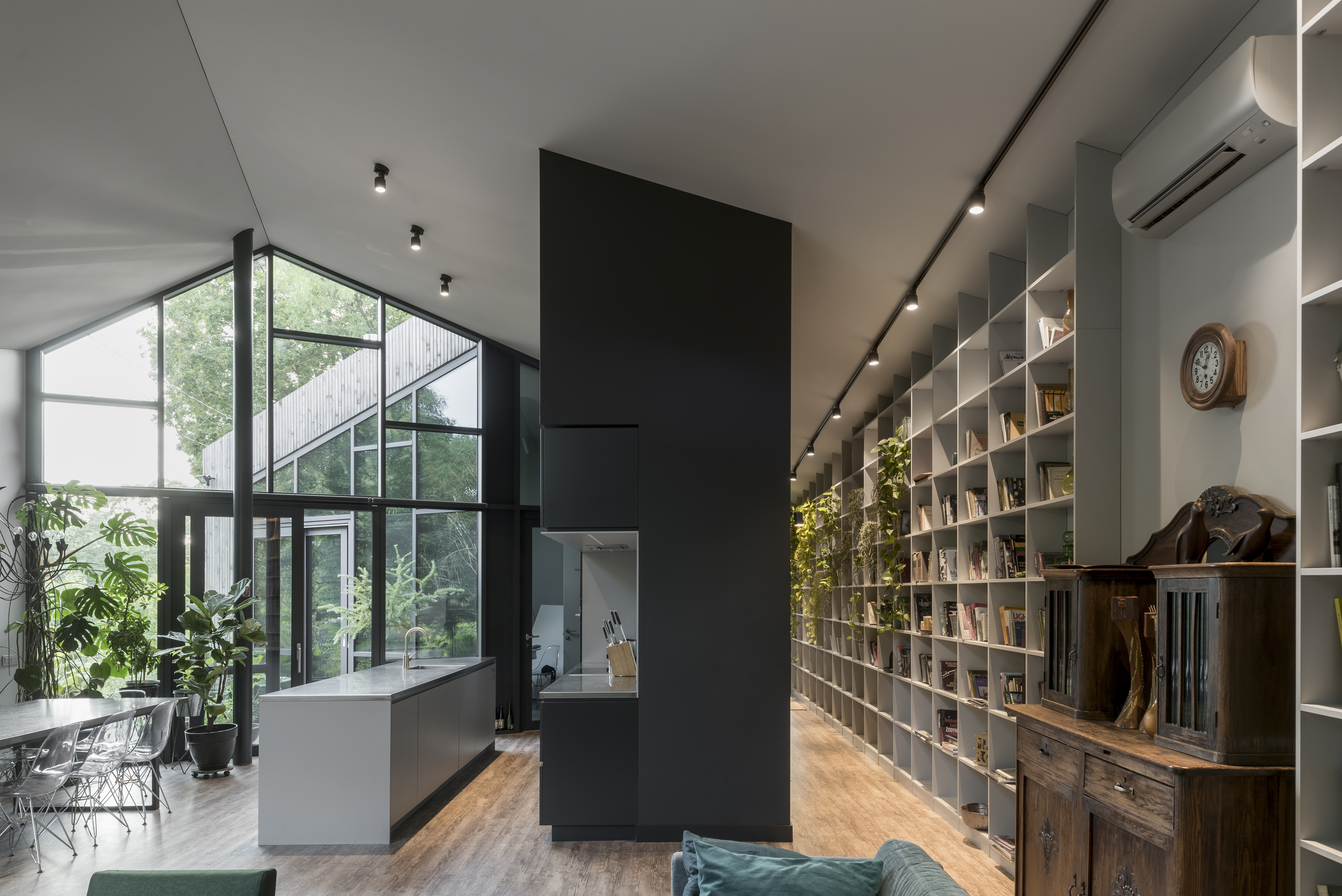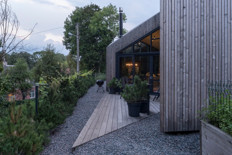 As the house owner is one of the most well-known designers in Lithuania, it’s not too unusual that the house’s design shows some meaningful imitation. If we consider the project metaphorically, we can compare the building to a massive piece of wood with some glowing axe marks. It not only glows from the inside after sunset, but in the daytime, these glass walls on the cuts also provide natural light to the interior space.