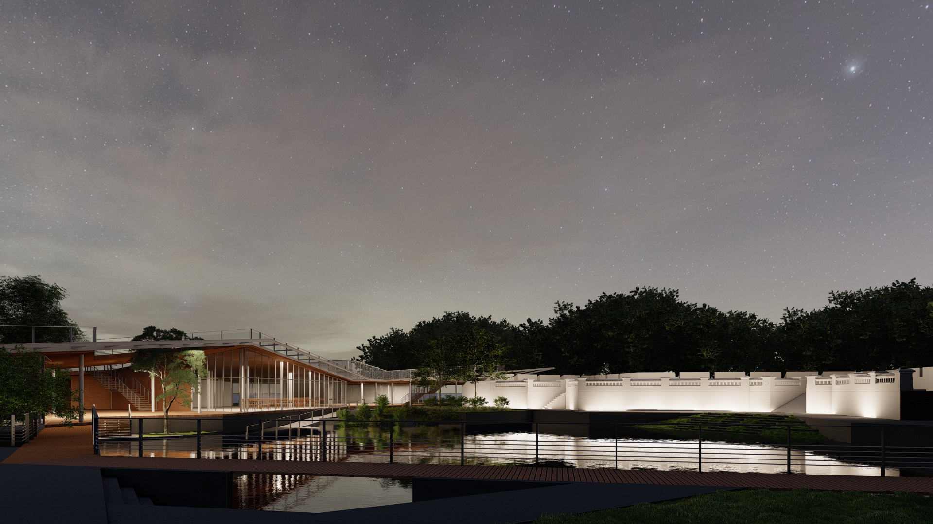 สำหรับเรา การเริ่มต้นวาดเส้นสายโดยใช้ป้อมป้องปัจจามิตรเป็นจุดตั้งต้นถือเป็นวิธีที่สร้างสรรค์และเคารพสถาปัตยกรรมเจ้าถิ่นที่อยู่มาก่อนนับร้อยปี ดนอธิบายเพิ่มเติมว่าสาเหตุที่เขาตัดสินใจกดพื้นภายในกรอบรูปดาวแปดแฉกที่เติมเต็มรูปทรงเดิมของป้อมให้ลดระดับลงไปจากชั้นดินเดิมนั้น ส่วนหนึ่งก็เพื่อให้ปราการที่หลงเหลืออยู่แห่งนี้ไม่ถูกสิ่งใดบดบังและส่งเสริมให้สถาปัตยกรรมดูยิ่งใหญ่ขึ้นจากมุมมองทางด้านล่าง นอกจากนี้ยังสามารถใช้เป็นพื้นที่รองรับน้ำในยามที่ระดับน้ำในเจ้าพระยาสูงขึ้นหรือเวลาฝนตกหนักได้อีกด้วย