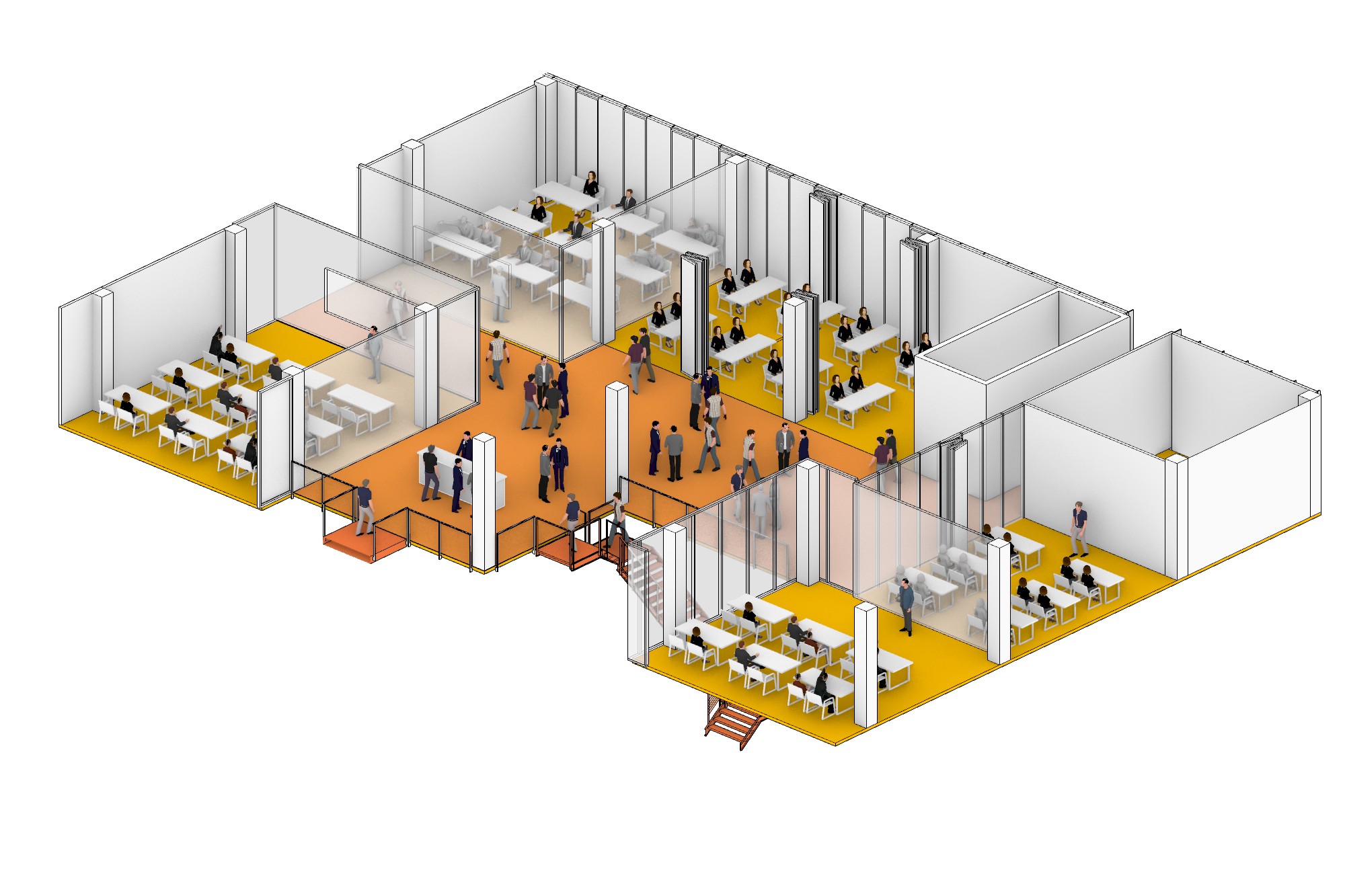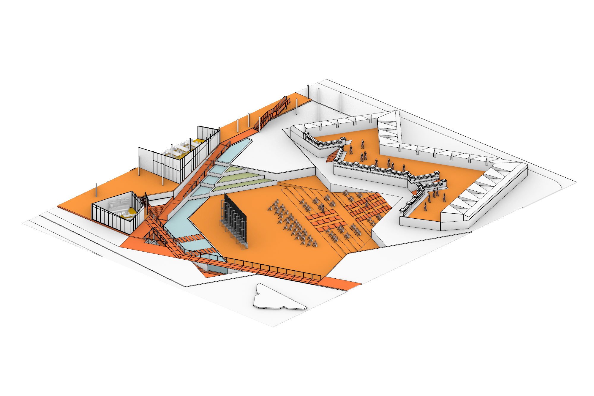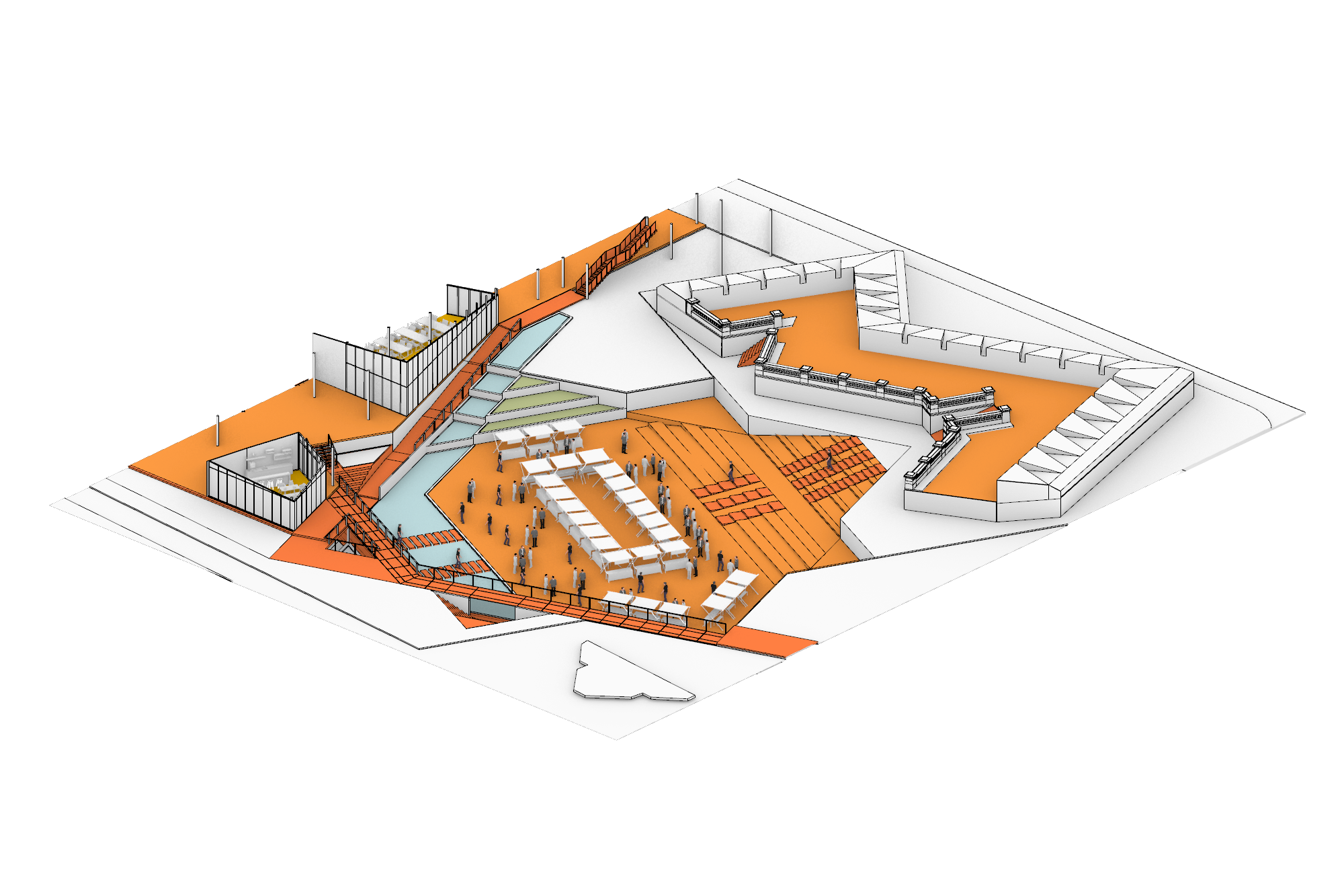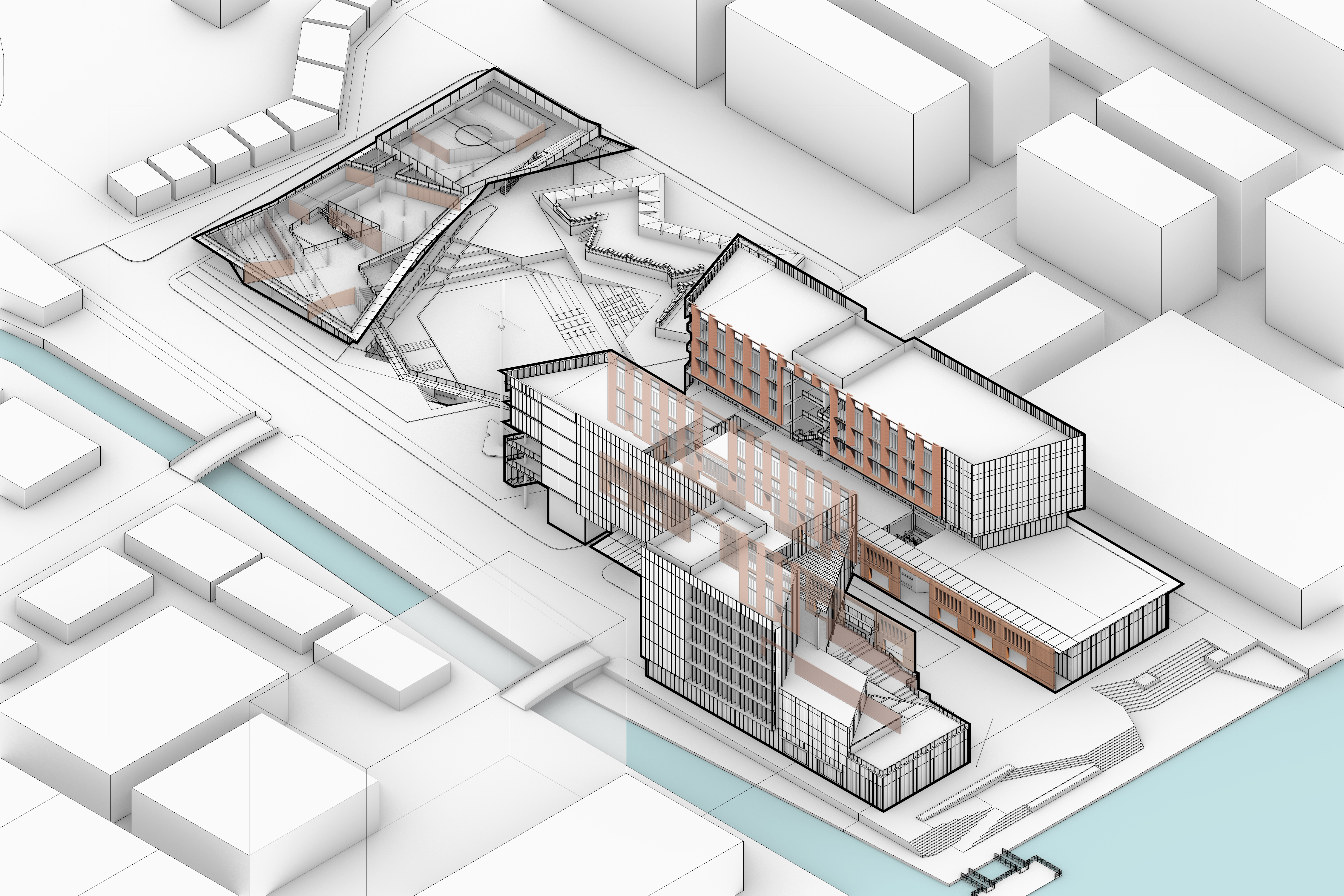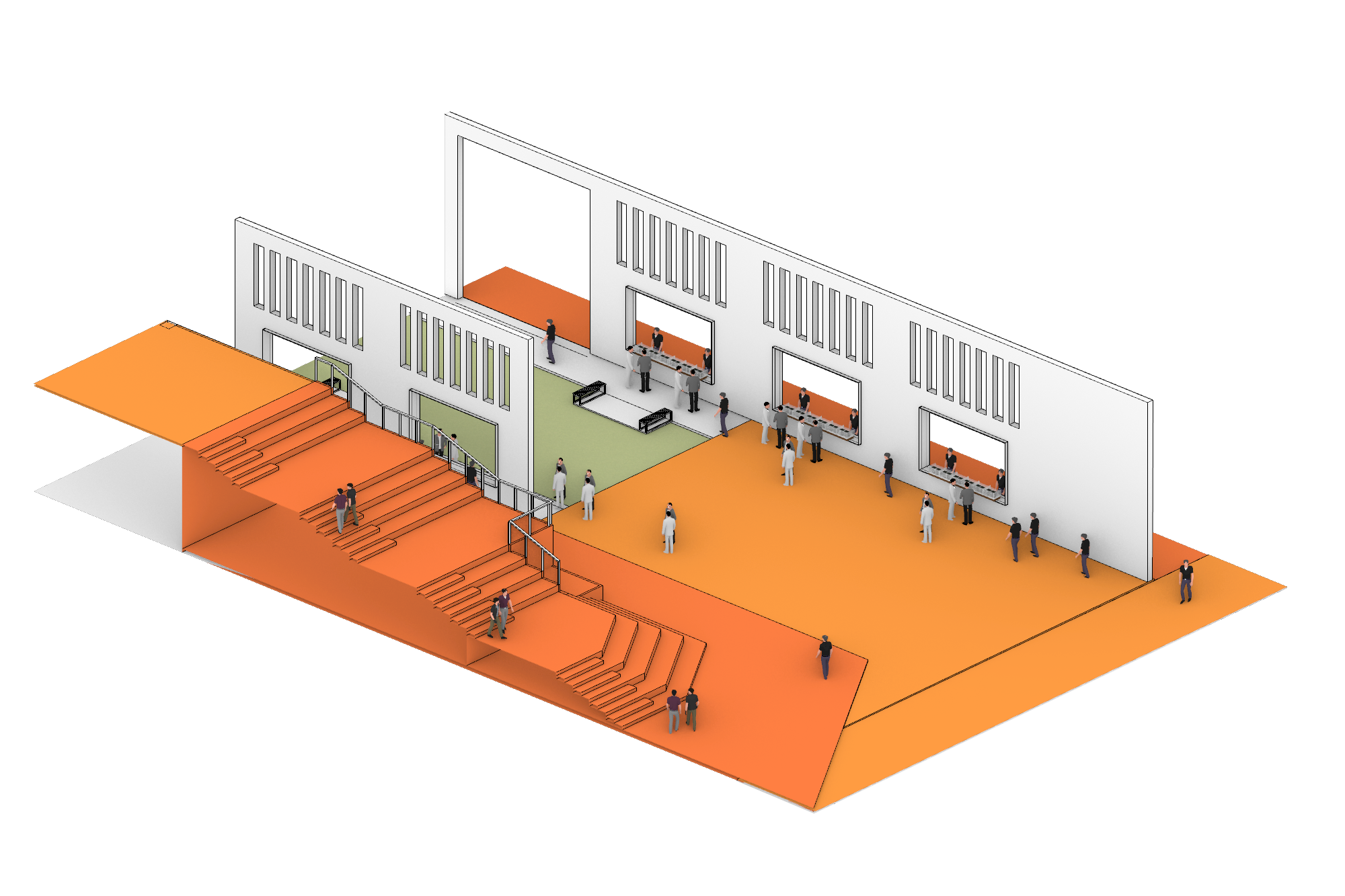 มาลงลึกถึงดีเทลของพื้นที่สำหรับประชาชนทั่วไปเพิ่มเติมสักนิด ห้องสมุด ห้องอาหาร และห้องประชุมของสำนักงานคือ facility ที่ประชาชนทั่วไปสามารถเข้ามาใช้งานได้หลังเวลาราชการ ซึ่งจะว่าไปแล้วก็ลงล็อคกับเวลาเลิกงานของเหล่ามนุษย์เงินเดือนพอดิบพอดี หากมองกันจาก diagram ดีๆก็คงก็พอเห็นกันได้ว่าโปรแกรมเหล่านี้จะเกาะอยู่ตามทางเดิน semi-outdoor ที่ผ่ากลางอาคาร เพื่อให้คนนอกสามารถเข้าถึงได้ง่ายนั่นเอง