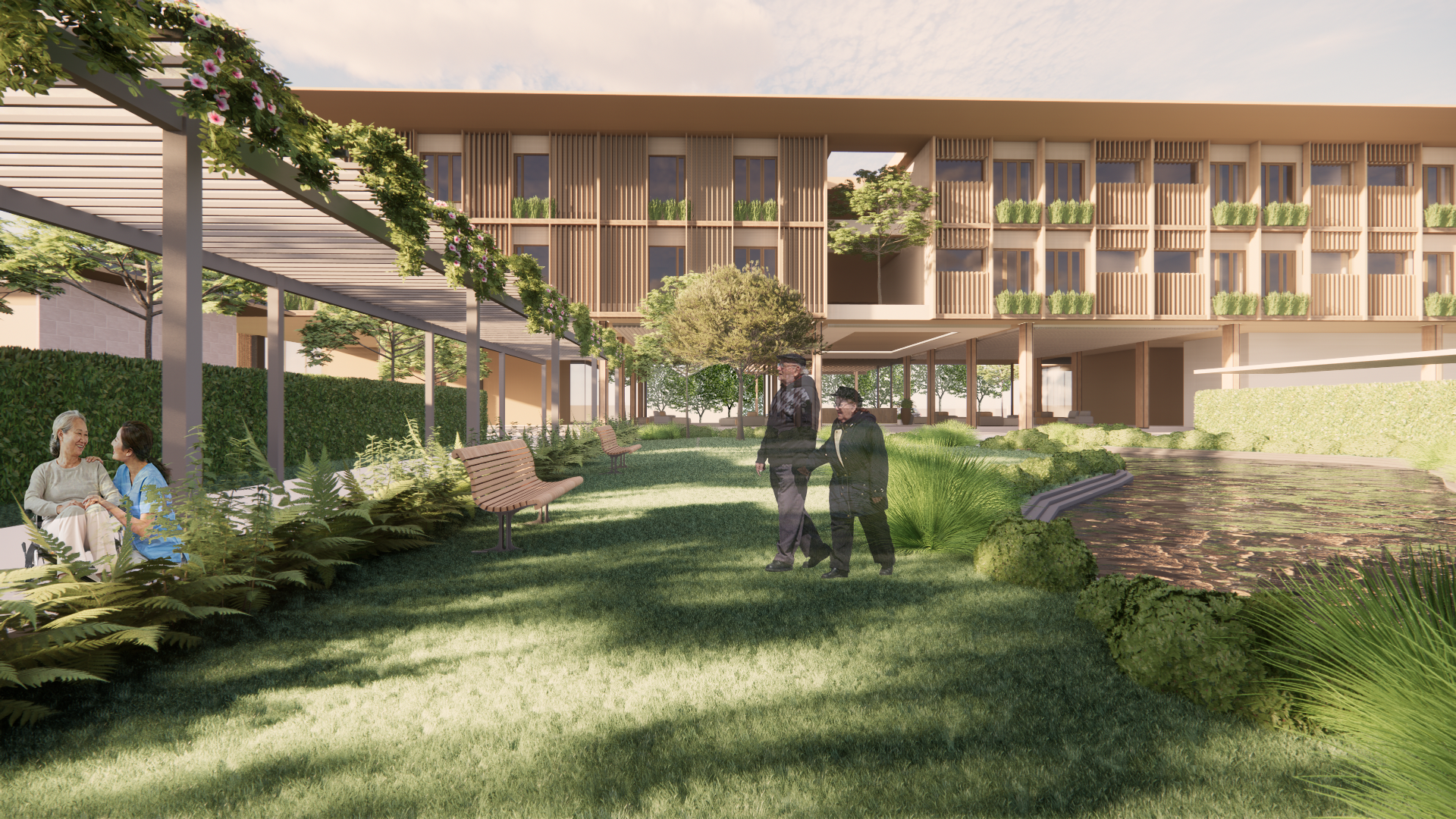 สำหรับอาคารพักอาศัยนั้น เรามาเริ่มดูกันจากจุดที่เบสิคที่สุดในโครงการอย่างพื้นที่สำหรับผู้ป่วยที่มีอาการเพียงระดับแรกเริ่มกันก่อน หากมองกันจากในแปลนแล้วก็คือกลุ่มอาคารที่ถูกไฮไลท์ไว้ด้วยสีเขียวนั่นเอง การวางผังสำหรับบริเวณนี้ดูคล้ายการจัดวางหมู่บ้านเล็กๆ มีพื้นที่อยู่อาศัยล้อมสวนสวยตรงกลางเพื่อให้ทุกคนสามารถออกมาใช้เวลากับพื้นที่ด้านนอกด้วยกันได้ มีเส้นทางการสัญจรอยู่รอบนอก และแพรวก็ไม่ลืมที่จะนึกเผื่อไปถึงการสร้างมุมมองให้ user มีปฏิสัมพันธ์กับผู้อื่นได้ด้วย