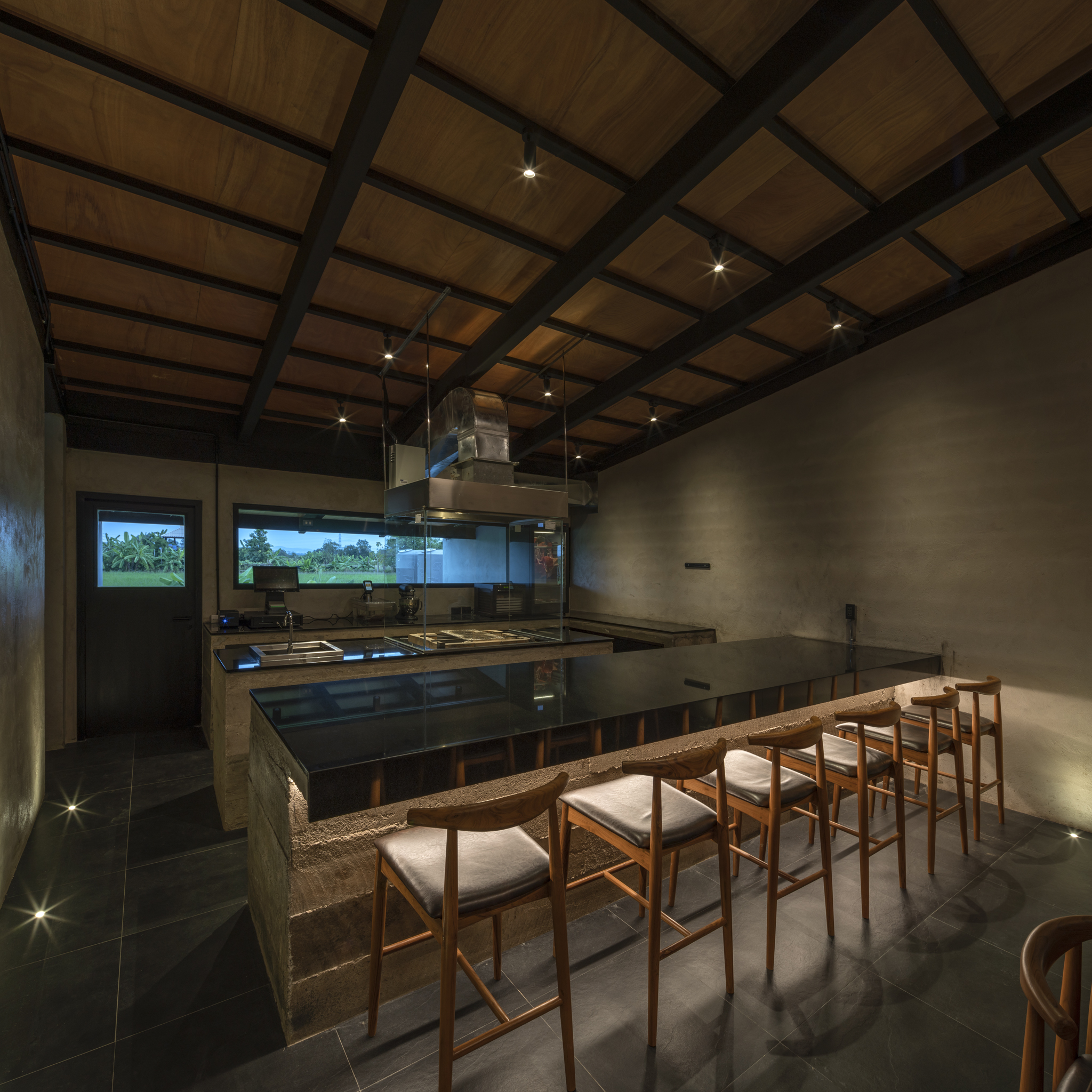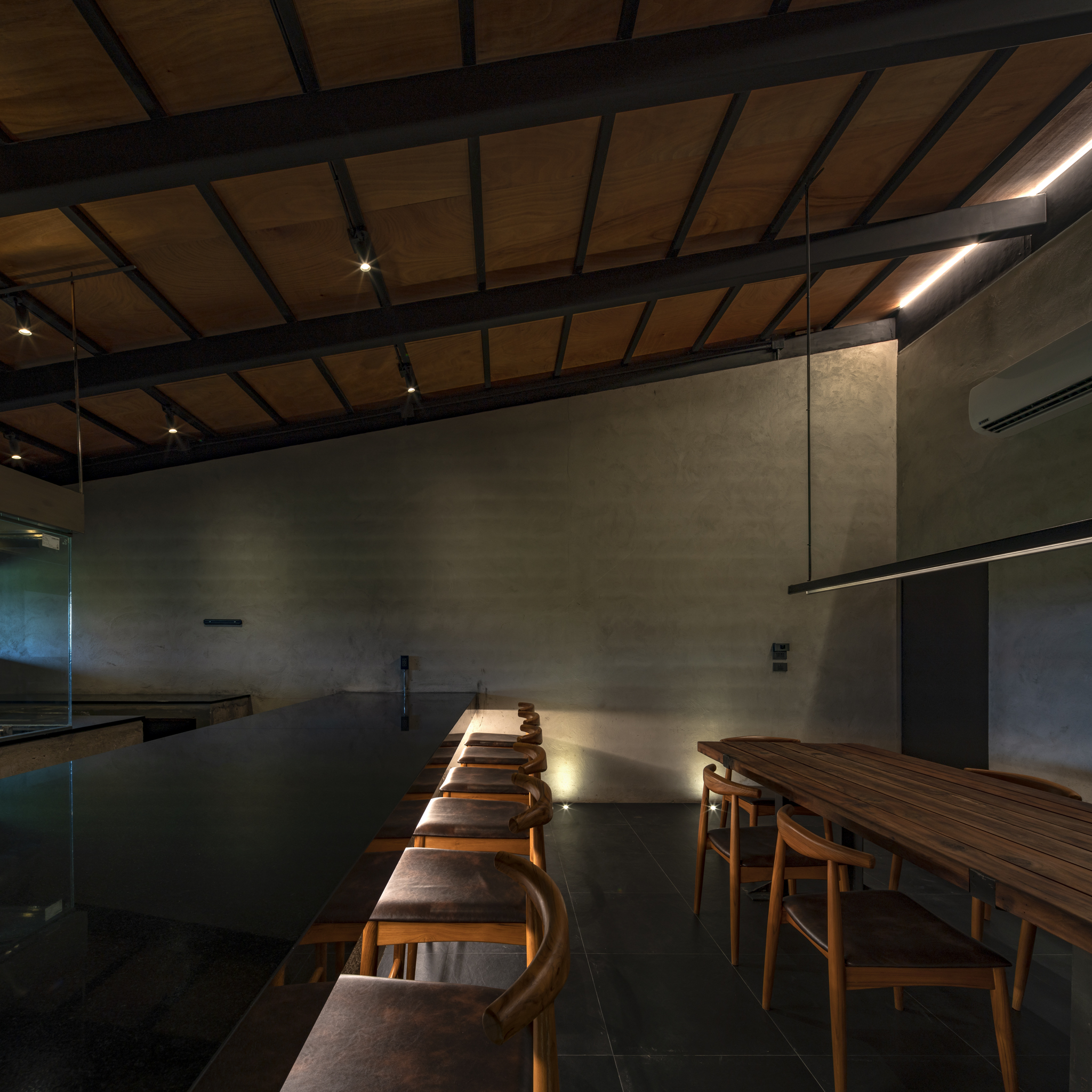 “หลังจากที่เดินผ่านโถงทางเข้าไปแล้ว พอเปิดประตูอีกบานก็จะเป็นห้องอาหารหลักที่แบ่งเป็นส่วนของเชฟ ซึ่งจะเป็นเคาน์เตอร์ขนาดใหญ่ที่เอาไว้สำหรับเตรียมอาหาร” สถาปนิกให้ข้อมูลกับเราเช่นนั้น “เคาน์เตอร์นี้ถูกหล่อขึ้นมาทั้งหมดโดยใช้ formwork เป็นไม้เพื่อที่จะให้มี texture ของไม้และท็อปด้วยหินแกรนิตสีดำ ตัดกับบรรยากาศโดยรวมของห้องทั้งหมด”