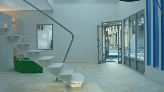 การออกแบบพื้นที่เปิดโล่งแบบเชื่อมถึงกันบริเวณชั้นล่างของอาคารให้มีกระจกบานใหญ่เพื่อรับแสงธรรมชาติ และช่องเปิดทรงกลมเพื่อให้อากาศถ่ายเทตามแนวคิดสถาปัตยกรรมแบบโมเดิร์น และถูกใช้เป็น Public Area ทั้งพื้นที่ต้อนรับ พักผ่อน ห้องครัว ส่วนรับประทานอาหาร และห้องนอนแขก ส่วนบันไดขั้นไปที่ชั้นสองของอาคารจะอยู่บริเวณกลางบ้านที่แลดูจะขาดความปลอดภัยและความเหมาะสมในการใช้งาน บริเวณชั้นสองเป็นระเบียงและห้องนอนที่มีกระจกทรงกลมขนาดคล้ายดวงตาของหุ่นยนต์ใหญ่อยู่ภายในห้อง