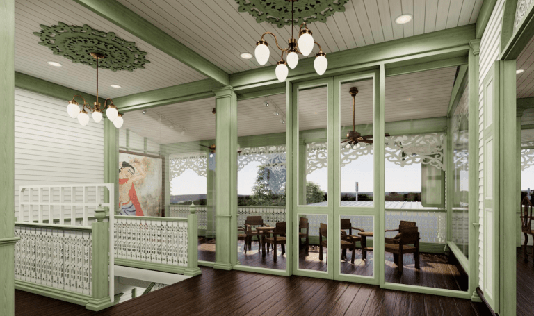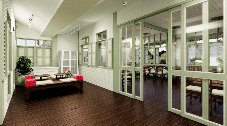 จึงทำให้เวลาที่ผมเห็นบ้านหลังนี้ ก็จะนึกถึงชื่อของ “คุณหญิงบัวเขียว” เราจึงรู้สึกว่าสุดท้ายแล้วบ้านก็ต้องมีสีสักสี เราจึงเลือกออกมาเป็นสีเขียวของดอกบัวที่ก่อนจะแย้มบาน มันเหมือนเราค่อย ๆ เล่าไอเดียไป สิ่งที่ตาเห็น แล้วก็เรื่องราวที่มาพร้อมกันซึ่งนำมาสู่งานที่มีลักษณะคล้ายคลึงกับคุ้ม แบบที่มีความเป็นจังหวัดแพร่โดยในแต่ละห้องได้ถูกออกแบบ แล้วตั้งตีมของแต่ละห้องที่ได้รับการออกแบบโดย IDEA2architect พร้อมถูกตั้งชื่อที่ถูกแปลงมาจากคำขวัญของเมืองแพร่