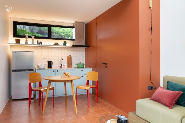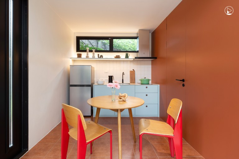 ในส่วนของพื้นที่เตรียมอาหาร และพื้นที่นั่งเล่น ได้ถูกออกแบบให้มีการเชื่อมต่อกันอย่างไร้รอยต่อโดยไม่มีผนังกั้น วัสดุปูพื้นห้องครัวที่ใช้กระเบื้องดินเผา ให้ผิวสัมผัสที่แตกต่างจากกระเบื้องยางลายไม้ ทำให้พื้นที่แยกกันเป็นสัดส่วน แต่ยังคงไว้ซึ่งความกลมกลืน