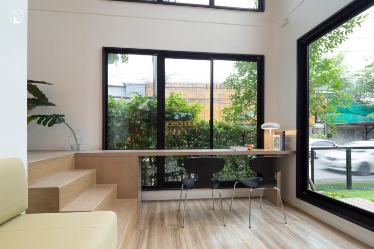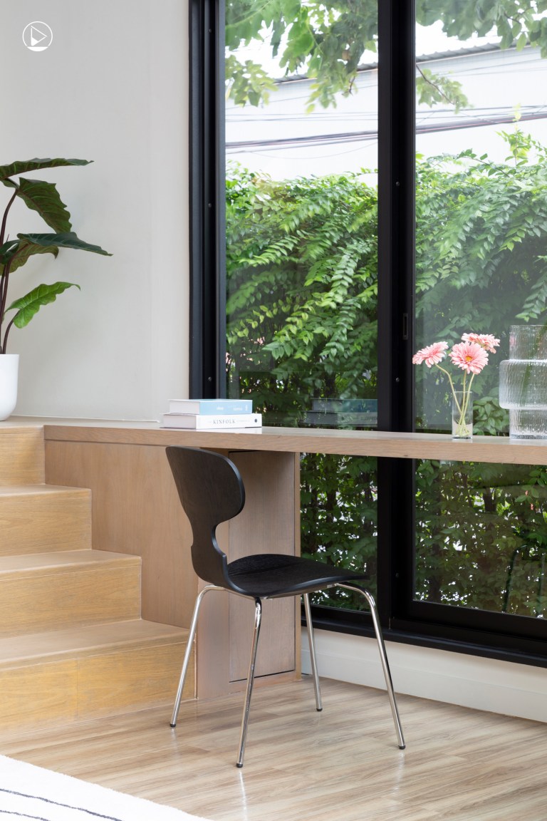 พื้นที่ที่รวมเฟอร์นิเจอร์ Built-in เข้ากับองค์ประกอบทางสถาปัตยกรรมอย่างลงตัว ด้วยการยกพื้นให้เป็นที่นั่งที่เชื่อมต่อกับชานพักบันได หรือการออกแบบโต๊ะยาวที่ทำหน้าที่เป็นราวกันตกในชั้นห้องนอน ซึ่งการผสานองค์ประกอบเหล่านี้ทำให้พื้นที่ภายในบ้านรู้สึกต่อเนื่องเป็นหนึ่งเดียวกัน และมอบความสวยงามที่มีฟังก์ชันการใช้งานสูงสุด ในลักษณะของ Open Plan แนวคิดการออกแบบพื้นที่ที่เน้นความเปิดโล่งและการเชื่อมต่อกันระหว่างพื้นที่ต่างๆ ภายในบ้านหรืออาคาร ซึ่งได้รับความนิยมมากขึ้นในยุคปัจจุบัน เนื่องจากสามารถตอบโจทย์ความต้องการของคนยุคใหม่ที่มีไลฟ์สไตล์หลากหลายและกิจกรรมที่เปลี่ยนแปลงอยู่เสมอ