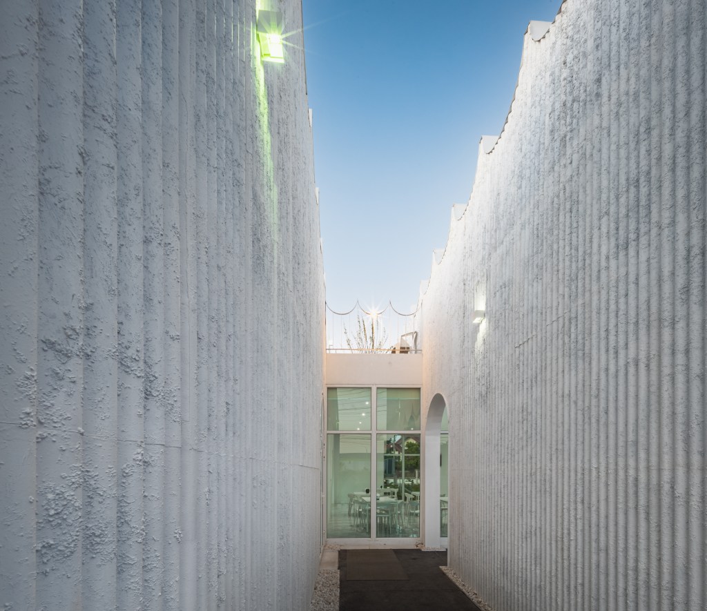 พื้นที่ภายในร้านเน้นการตกแต่งด้วยสีขาวที่ช่วยเปิดโอกาสให้เล่นกับแสงสีได้ในยามค่ำคืน รวมถึงช่องสกายไลต์ที่เปิดมุมมองสู่ท้องฟ้า ช่วยสร้างความรู้สึกราวกับว่าอยู่ใต้น้ำ ทำให้ในแต่ละช่วงเวลาของวันมีบรรยากาศแตกต่างอย่างชัดเจน กลายเป็นผลงานสถาปัตยกรรมที่มีลูกเล่นในทุกรายละเอียด และสามารถสร้างความประทับใจให้ผู้เข้ามาใช้งานได้ทุกวัน-เวลา เพราะการสอดรับกันอย่างเป็นจังหวะของที่ว่างและ Mass นี่จึงเป็นที่มาของชื่อบทที่ว่า ฟอร์มพริ้วไหวในสเปซ นั่นเอง