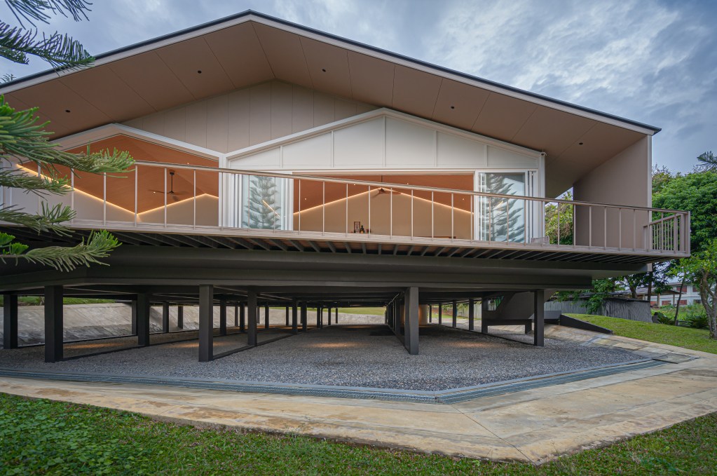 หลังคาทรงจั่วสูงไม่เพียงช่วยเพิ่มความเย็นสบาย แต่ยังเปิดโอกาสให้แสงธรรมชาติเข้าสู่ตัวบ้านอย่างพอเหมาะในช่วงกลางวัน การออกแบบนี้ช่วยลดการใช้พลังงานไฟฟ้าสำหรับแสงสว่างและเครื่องปรับอากาศ