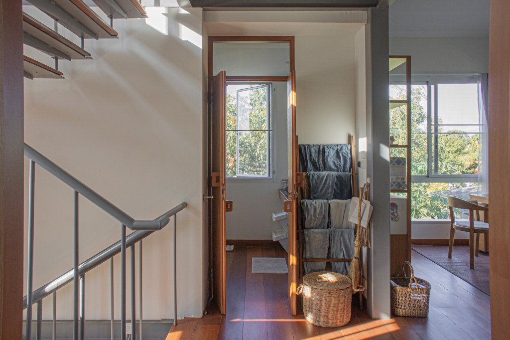 บ่ขวางใจ๋ บ่เร่งเร้า แต่ชวนให้ล่อง ในสถาปัตยกรรมพื้นถิ่นเหนือ บันไดเรือนไม้มักถูกออกแบบให้มี “หัวบันได” เป็นที่นั่งพูดคุย หรือพักก่อนเข้าสู่ตัวเรือน บันไดบ้านฮ่มใจ๋แม้จะอยู่ภายใน แต่ก็ยังรักษาบรรยากาศเช่นนั้นไว้ โดยการจัดวางพื้นที่ให้มีระเบียงเล็ก ๆ ข้างบันไดซึ่งสามารถใช้เป็นที่นั่งอ่านหนังสือหรือสังเกตความเคลื่อนไหวของบ้าน