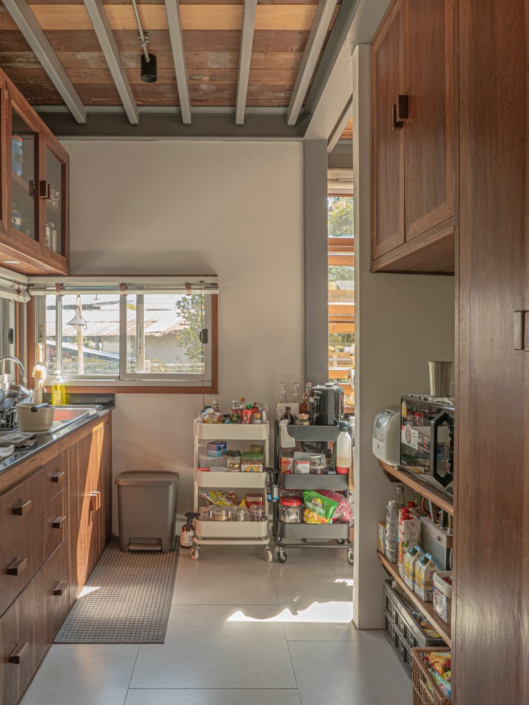 ความน่ารักของครัวบ้านนี้อีกอย่างคือ มันไม่ได้พยายามจะเรียบร้อยหรือจัดแต่งจนไร้ชีวิตจริง ตู้เก็บของ ชั้นวาง ถาดเครื่องปรุง และตะกร้าเก็บของแห้งต่าง ๆ ถูกจัดวางในลักษณะที่ใช้งานได้จริง ไม่ปิดบังความเป็น “บ้านที่มีชีวิต” และไม่กลัวของจะเยอะ เพราะที่ที่เรารู้สึกปลอดภัย คือที่ที่เราสามารถปล่อยของ ปล่อยใจ และปล่อยให้บ้านเป็นของเราได้จริง