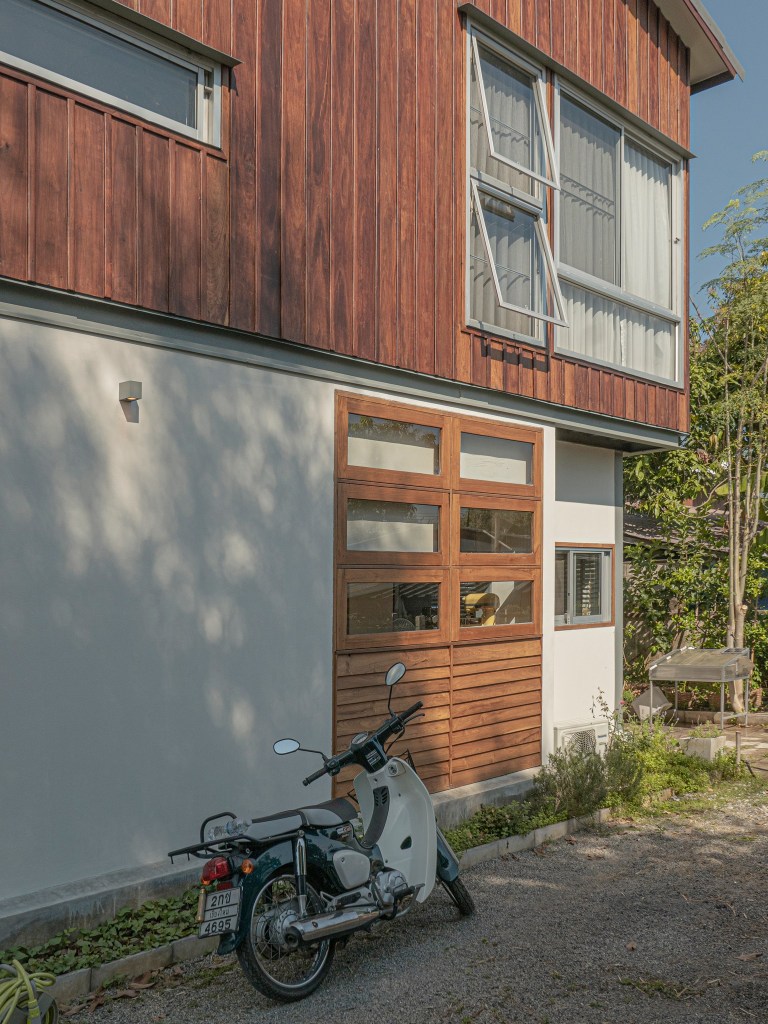แม้ใช้โครงสร้างเหล็กแต่ผิวสัมผัสของบ้านยังคงกลิ่นอายพื้นถิ่นอย่างชัดเจน ผนังไม้ประดู่เก่าที่กรุรัดรอบบ้านตั้งแต่ชั้นสองขึ้นไป ทำหน้าที่เหมือนผ้าห่มบาง ๆ ที่โอบตัวอาคารไว้ สีเทาอ่อนของโครงเหล็กตัดกับสีอบอุ่นของไม้ แต่ไม่แข็งขัดกัน ภาพรวมจึงเหมือนบ้านครึ่งไม้ครึ่งปูนที่พบเห็นได้ทั่วไปในเมืองเหนือ