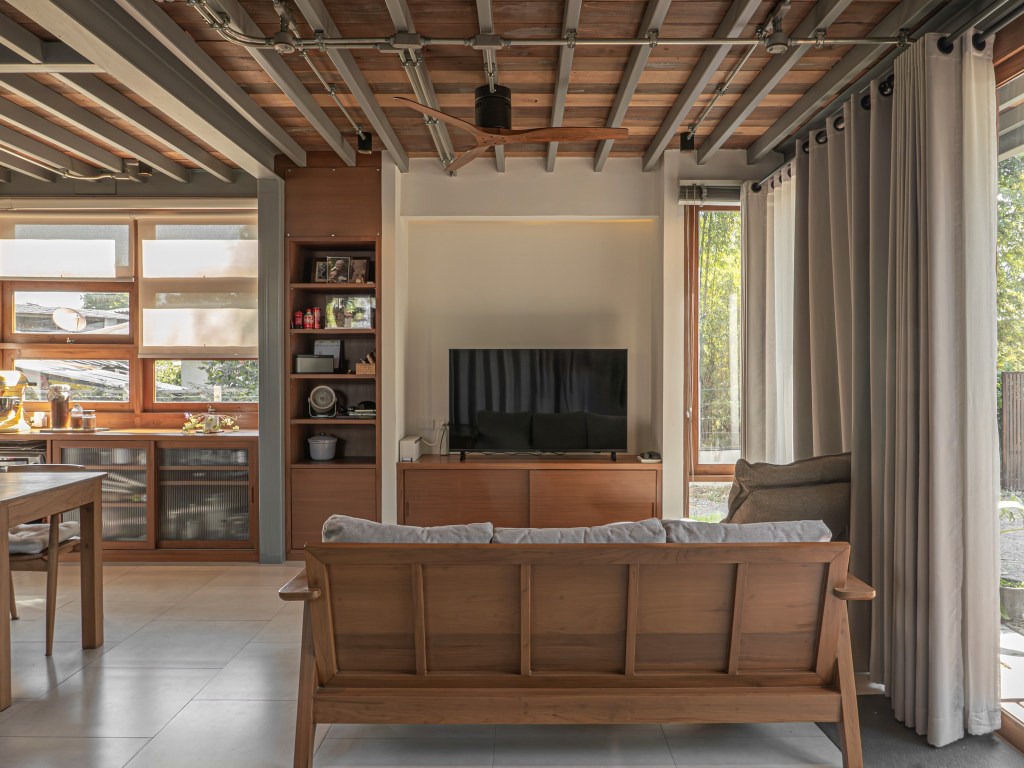 ความน่าสนใจอีกอย่างของวัสดุในบ้านนี้คือการจับคู่กันระหว่าง “ไม้เก่า” กับ “เหล็กใหม่” ไม้ประดู่เก่าที่นำมาใช้ในหลายจุดของบ้านมีลายเสี้ยนที่อบอุ่น ให้ผิวสัมผัสที่เป็นมิตรและดูแลง่าย เหล็กโครงสร้างสีเทาที่เปลือยไว้ให้เห็นอย่างตรงไปตรงมา กลับดูไม่แข็งกระด้าง แต่กลมกลืนกับเพดานไม้และฝ้าโปร่ง เมื่อทั้งสองวัสดุอยู่ร่วมกัน จึงเกิดความรู้สึกมั่นคงและเบาในเวลาเดียวกัน